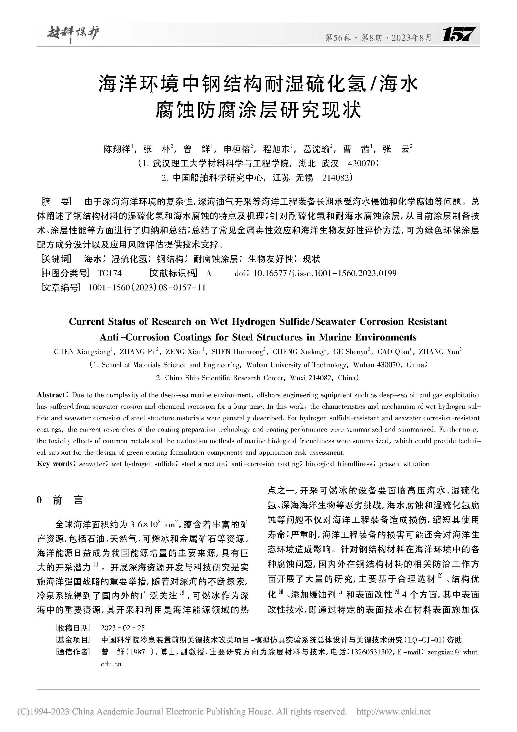 海洋环境中钢结构耐湿硫化氢/海水腐蚀防腐涂层研究现状
