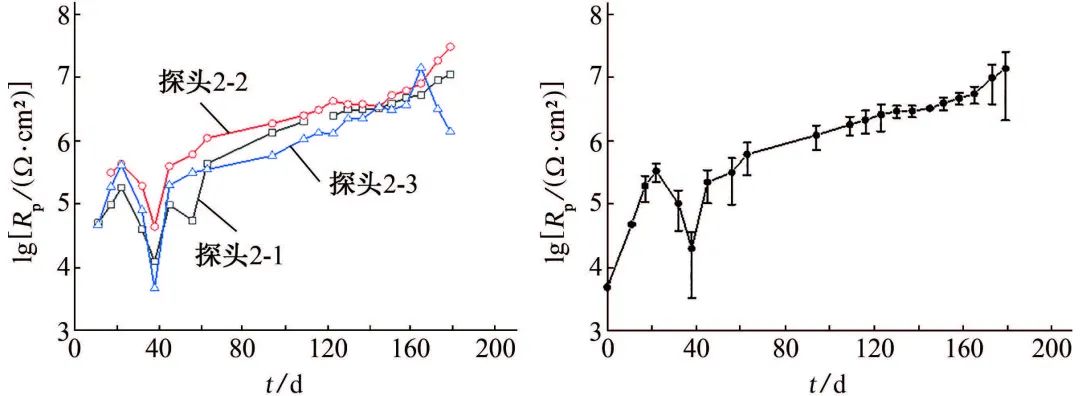 定期测量3组电化学监测探头的EIS,通过Zview2.0软件拟合得到极化电阻Rp,并计算3组探头极化电阻的均值和方差,结果如图3所示。