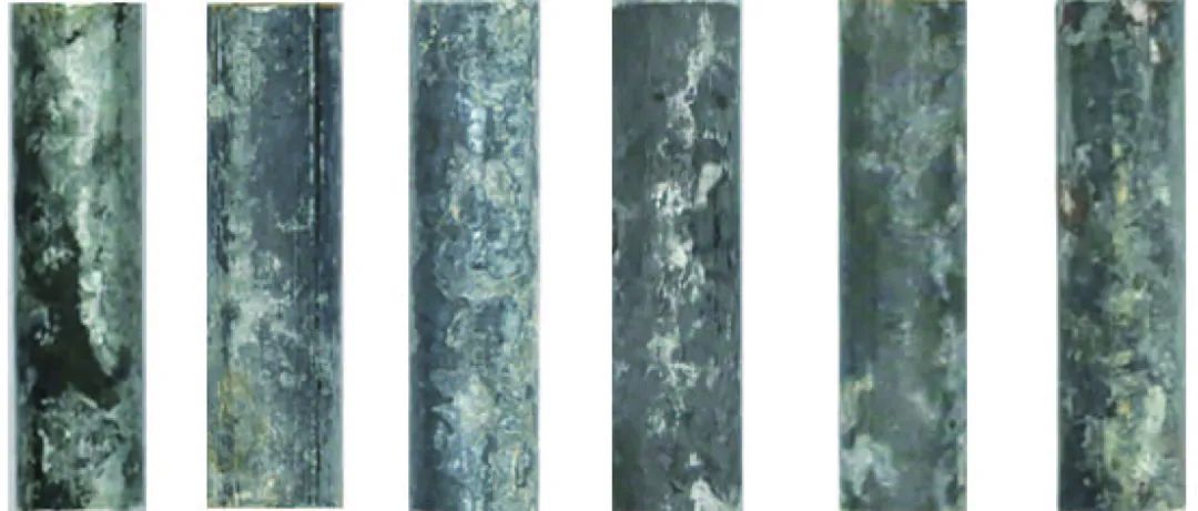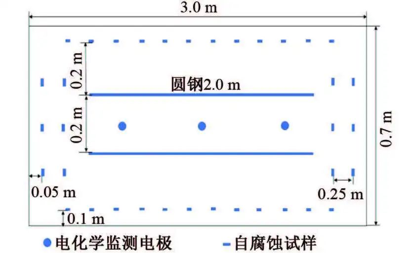 将镀锌圆钢加工成ф10 mm×50 mm的电极试样,在试样一端焊接铜导电(长度2 m),用环氧树脂封装试样两端,留出工作面积11.0 cm2(ф10 mm×35 mm)。电化学监测探头由3支电极试样按等边三角形排列(彼此间距约2 cm)组成,共制备了3组电化学监测探头。