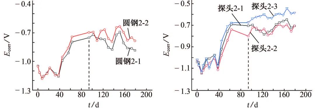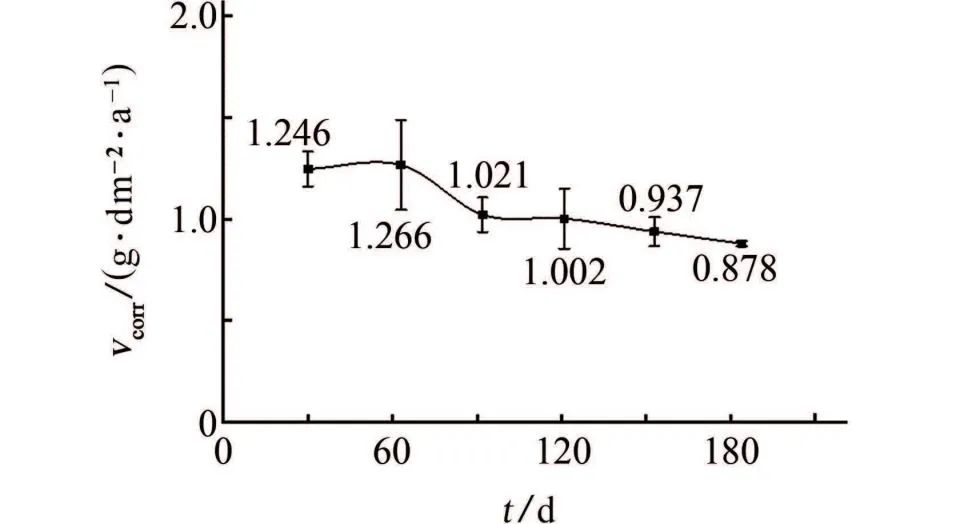 从图5可见,埋设时间为1~2月时,腐蚀速率vcorr较大且稍有增大趋势,但埋设时间超过2月后,腐蚀速率逐渐减小,埋设2~3月期间,腐蚀速率减小幅度最大,埋设3月后,腐蚀速率减小趋势变缓。