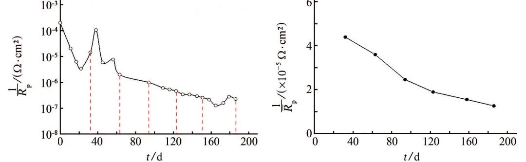 根据腐蚀电化学原理,极化电阻Rp与试样的腐蚀电流密度Jcorr呈反比关系,即Jcorr=B/Rp,其中B为Stern系数。因此,极化电阻倒数1/Rp可用来描述腐蚀速率的变化趋势。