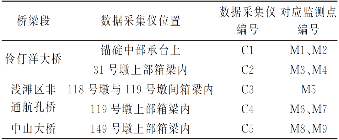 针对偏远或供电不便的区域,采用太阳能-蓄电池供电系统进行长期供电。采用无线网络进行远程数据传输,一套数据采集仪可与多个不同种类的传感器同时适配连接。一套数据采集仪负责同一结构上的所有传感器的通讯,数据采集系统详细布置如表5所示。