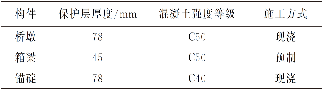 深中通道工程桥梁使用多、跨度广,涵盖超大跨径悬索桥、大跨径斜拉桥、浅滩区非通航孔桥和陆域引桥等。桥梁结构由上部结构、下部结构、支座及附属构造物组成。其中,上部结构为桥跨结构,包括箱梁、桥面等;下部结构包括桥台、桥墩和基础;支座为桥跨结构与桥墩或桥台支承处的传力装置;附属构造物包括桥头搭板、锥形护坡等。考虑到处于浪溅区的钢筋混凝土构件主要为桥墩、锚碇基础,因此在布置监测位点时,主要选择桥墩、锚碇基础实施监测,同时覆盖箱梁。其混凝土结构施工方式、保护层设计厚度及强度如表1所示。