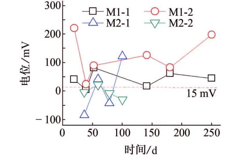 图5为多功能耐久性监测传感器从监测点M1、M2采集的数据。其中,M-1为靠近混凝土表面的监测点,M-2为远离混凝土表面的监测点。可见M1-1、M1-2处探针电位均高于15 mV,表明此处氯离子尚未达到临界浓度;而M2-2处探针电位低于15 mV,这是由于监测数据获取时间较短,此时受混凝土内部水分影响,数据仍存在波动。