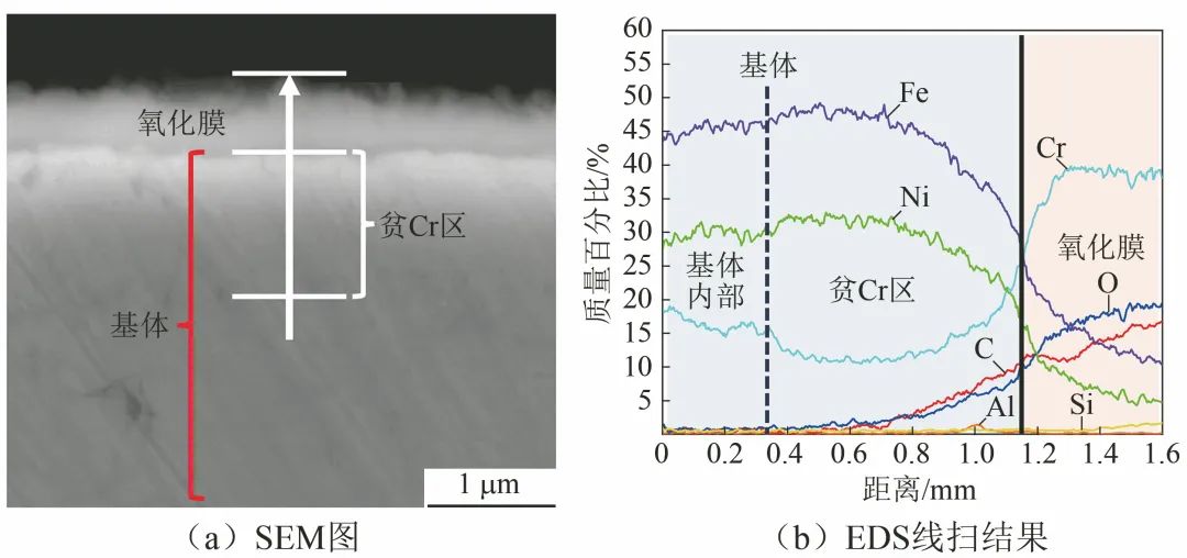图6 在650 ℃/20 MPa的sCO2环境中腐蚀300 h后800H合金截面的SEM图及EDS线扫结果