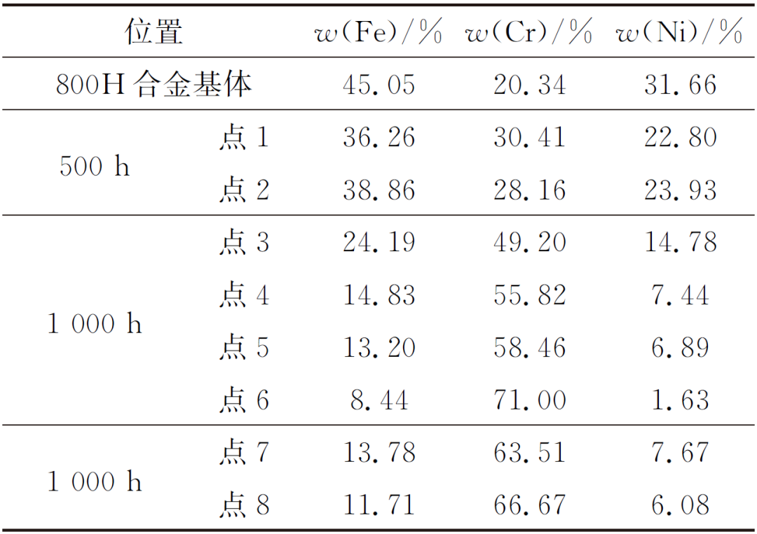 由图5(b)、(c)可见,腐蚀1000 h后,800H合金表面出现了不同种类的缺陷。对比点1、点2与点3的元素成分,发现随着腐蚀时间的延长,Cr元素的含量随之增加,而Fe、Ni元素的含量降低,这说明在800H合金表面富Cr氧化物的厚度逐渐增加。点4处的氧化物颗粒尺寸明显大于点3处,其形状仍为多边体,但较为稀疏。点5、点6处出现的白色不规则颗粒物中Cr含量要远高于表面均匀氧化膜。点7、点8为缺陷周边的取样点,该处Cr的含量比均匀氧化膜处有一定的增加,而相对于基体材料显著升高。