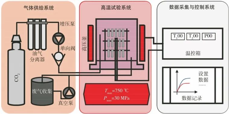 试验在高温高压气体试验回路中进行,该试验回路主要由气体供给系统、高温试验系统和数据采集与控制系统三部分组成,如图1所示。其中,高压釜由625镍基合金制成,容积约为3 L。试验温度为650 ℃,压力为20 MPa,试验介质为高纯度CO2(纯度为99.99%)。试验前,多次循环抽真空并充入CO2以除去釜内气体杂质。