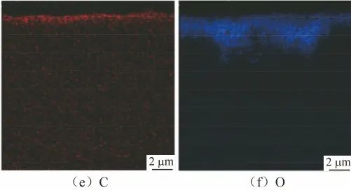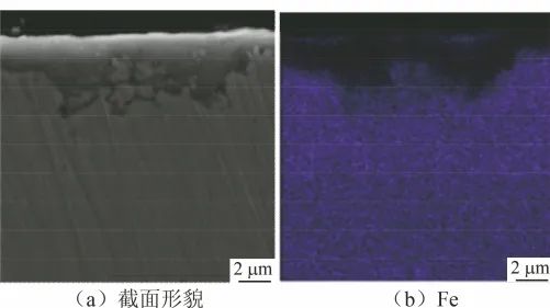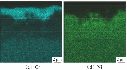 用扫描电镜观察在650 ℃/20 MPa的sCO2环境中腐蚀1000 h后800H合金的截面形貌,并用EDS面扫描分析元素分布情况,结果见图7。结果表明,在650 ℃/20 MPa的sCO2环境中腐蚀1000 h后,800H合金表面氧化膜厚度为1~4 μm。EDS面扫结果显示,表面氧化物主要成分富Cr。这与腐蚀300 h后截面线扫结果相吻合,仅在氧化膜表面发现较高含量的C。