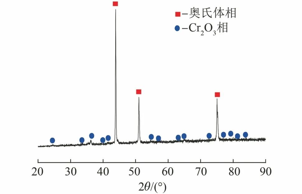 图4为800H合金在650 ℃/20 MPa的sCO2环境中腐蚀500 h后表面氧化膜的XRD谱。从图4中可以发现,奥氏体相的特征峰在整个XRD谱图中占有最高的强度,这说明800H合金表面生成的氧化膜厚度较薄。除奥氏体特征峰外,XRD还检测到了较微弱的Cr2O3的特征峰,说明表面氧化膜的主要成分为Cr的氧化物Cr2O3。