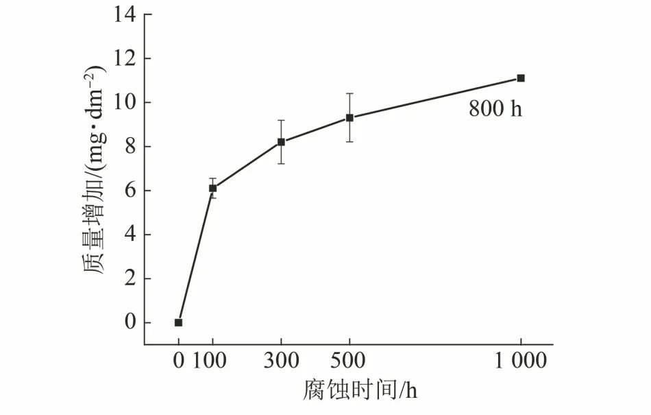 图2 在650 ℃/20 MPa的sCO2环境中腐蚀不同时间后800H合金的质量增加