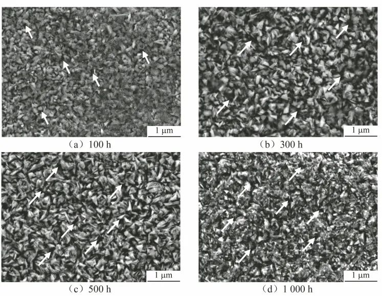 利用扫描电镜对在650 ℃/20 MPa的sCO2环境中腐蚀100、300、500、1000 h试样表面氧化膜的形貌进行观察和分析,结果如图3所示。800H合金在sCO2环境中腐蚀100 h后,其表面生成了一层连续的颗粒状氧化膜,氧化物颗粒间仍存在孔洞、缝隙等缺陷(图3中箭头标识区域)。该层氧化膜在一定程度上减弱了基体与腐蚀介质间的元素扩散,但氧化物颗粒间的孔洞、缝隙等缺陷为元素扩散提供了通道。结合800H合金的腐蚀质量增加曲线可知,试验进行到300 h时,其腐蚀速率才趋近于平缓。800H合金表面形成的氧化物颗粒的尺寸随着腐蚀时间的延长而逐渐增大,其分布变得更加密集。当腐蚀500~1000 h时,800H合金表面氧化物形貌和尺寸没有发生明显的变化,说明氧化物生长速率降低。腐蚀1000 h后,氧化物颗粒之间出现粘连,粘连处出现尺寸较小的氧化物颗粒,说明此时仍然有一定数量的氧化物在合金表面形成,且生长速率较为缓慢。