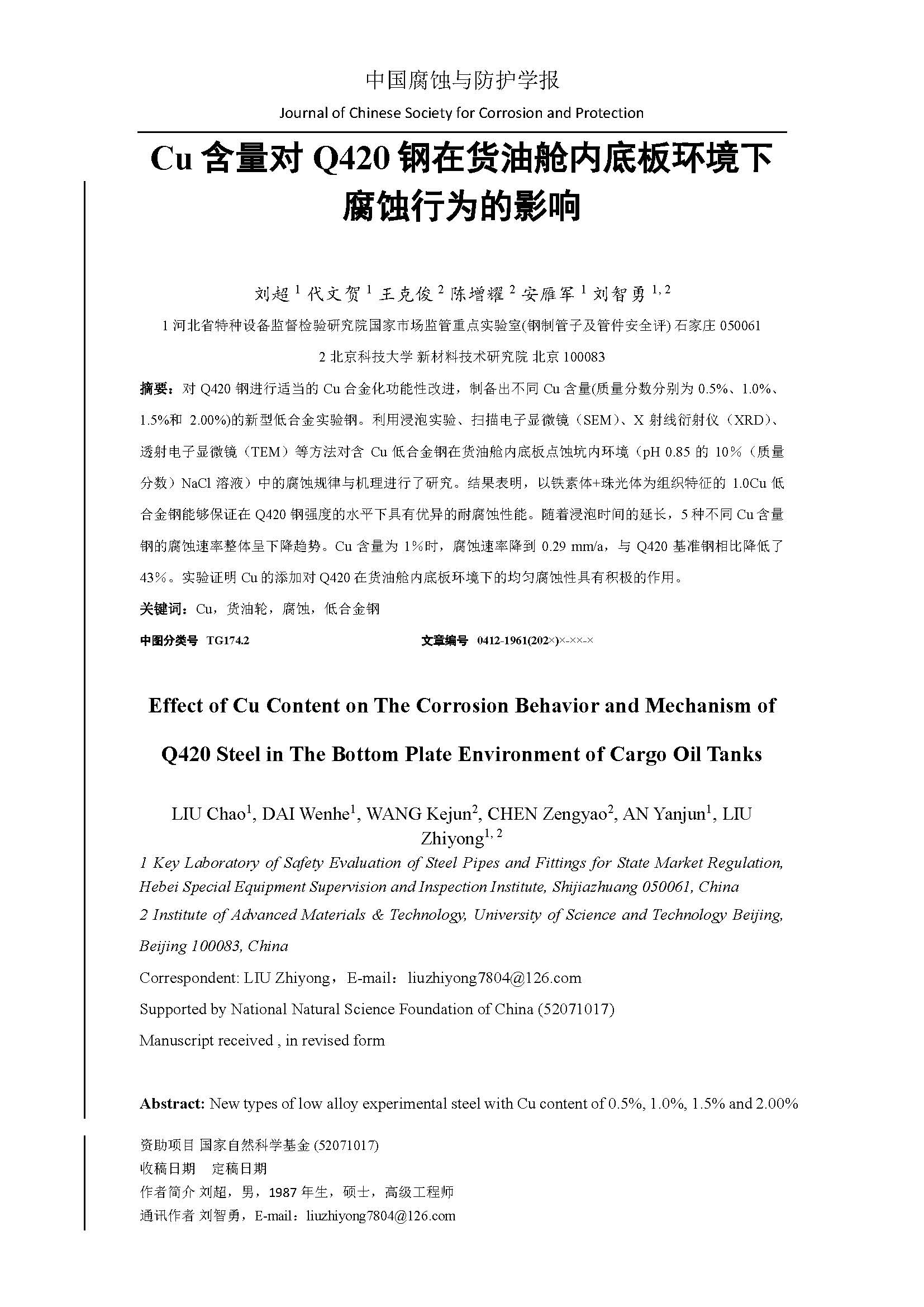 Cu含量对Q420钢在货油舱内底板环境下的腐蚀行为与机理的影响