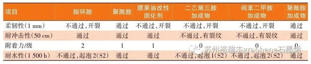 从表4可以看出,只有使用聚酰胺和聚酰胺加成物作为固化剂的涂层通过了性能测试。并且聚酰胺与环氧树脂反应制成聚酰胺加成物固化剂后,涂层附着力显著提高,这是因为加入了环氧化合物进行扩链,并对聚酰胺进行加成封端,调节了固化剂的活性,进而控制成膜时的反应速度[12],使涂层对底材的附着力得到了改善。