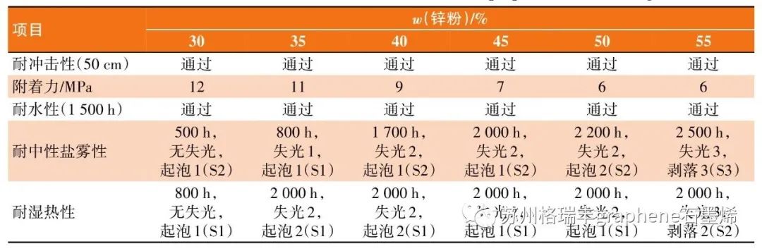 从表6中可以看出,锌粉质量分数为30%~55%的涂层,其耐冲击性和耐水性均通过,而附着力随着锌粉含量的增加出现下降的趋势,耐中性盐雾性随着锌粉含量的增加出现升高的趋势。附着力下降是因为当颜基比过高时,颜填料无法完全被树脂包裹,导致涂层和基材的结合力受到影响[19]。综合比较,45%~50%锌粉质量分数的环氧石墨烯锌粉涂料具有很好的综合性能,并且锌粉质量分数远低于传统环氧富锌涂料中的。后续实验中锌粉质量分数为45%。