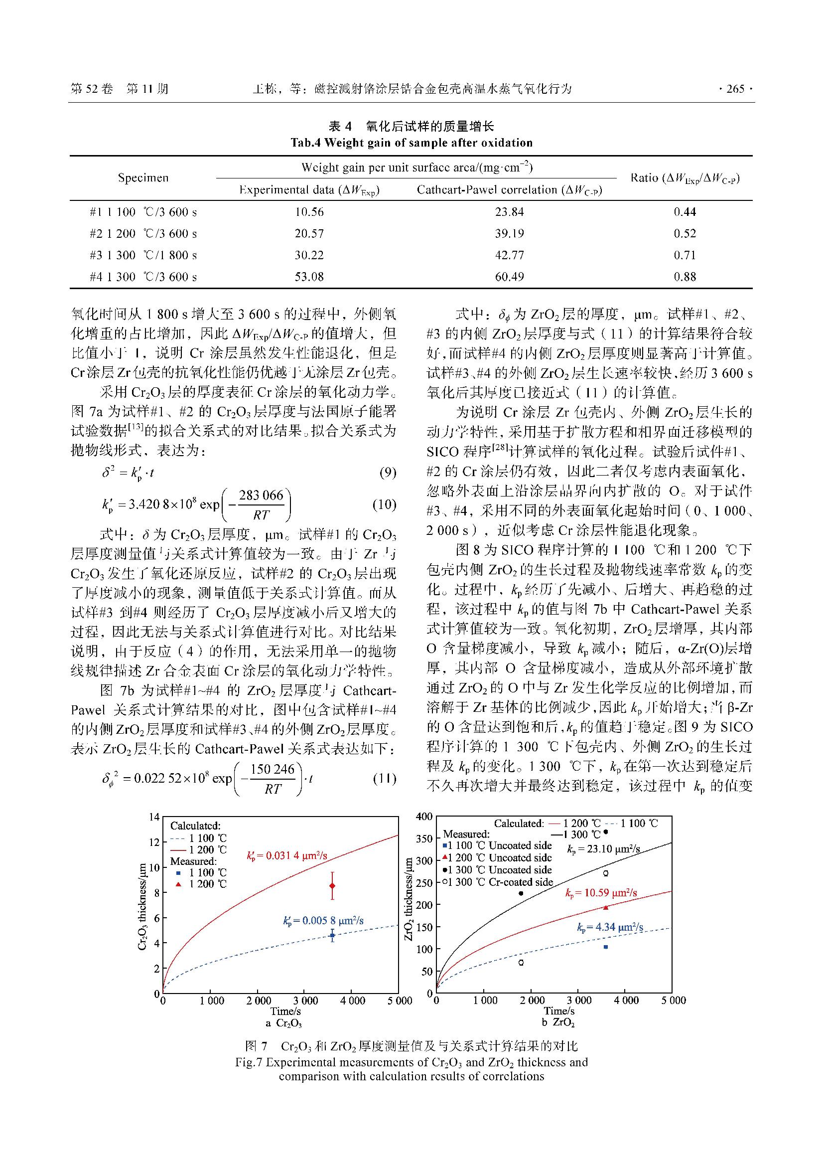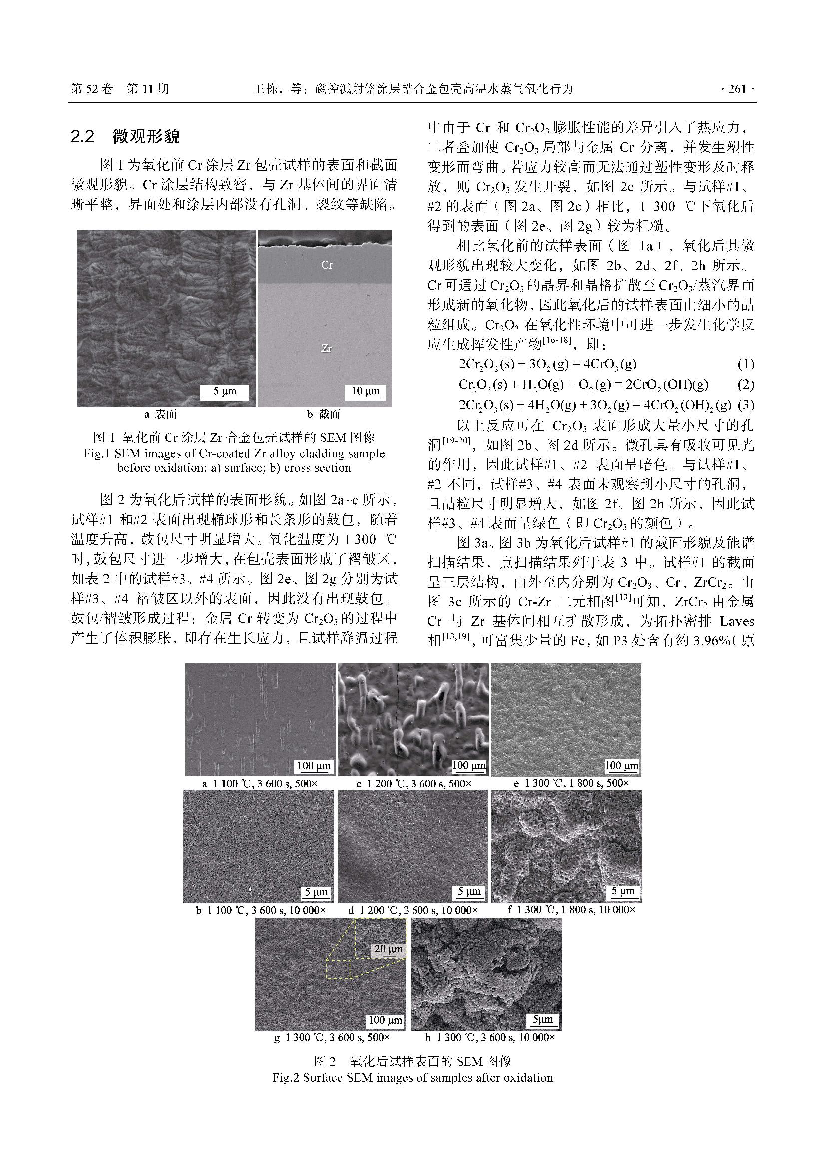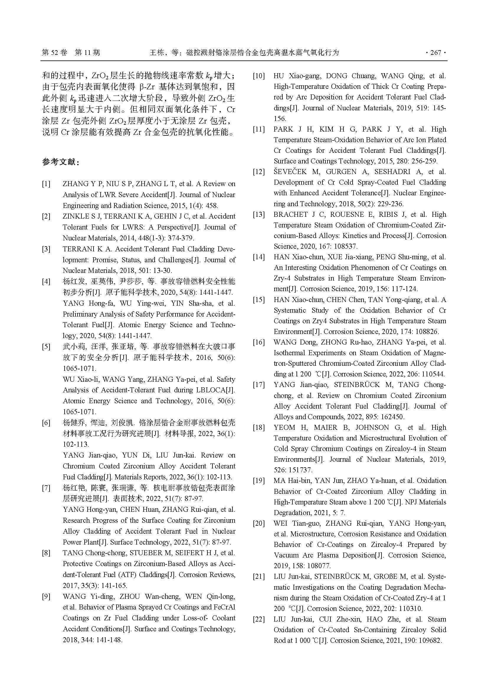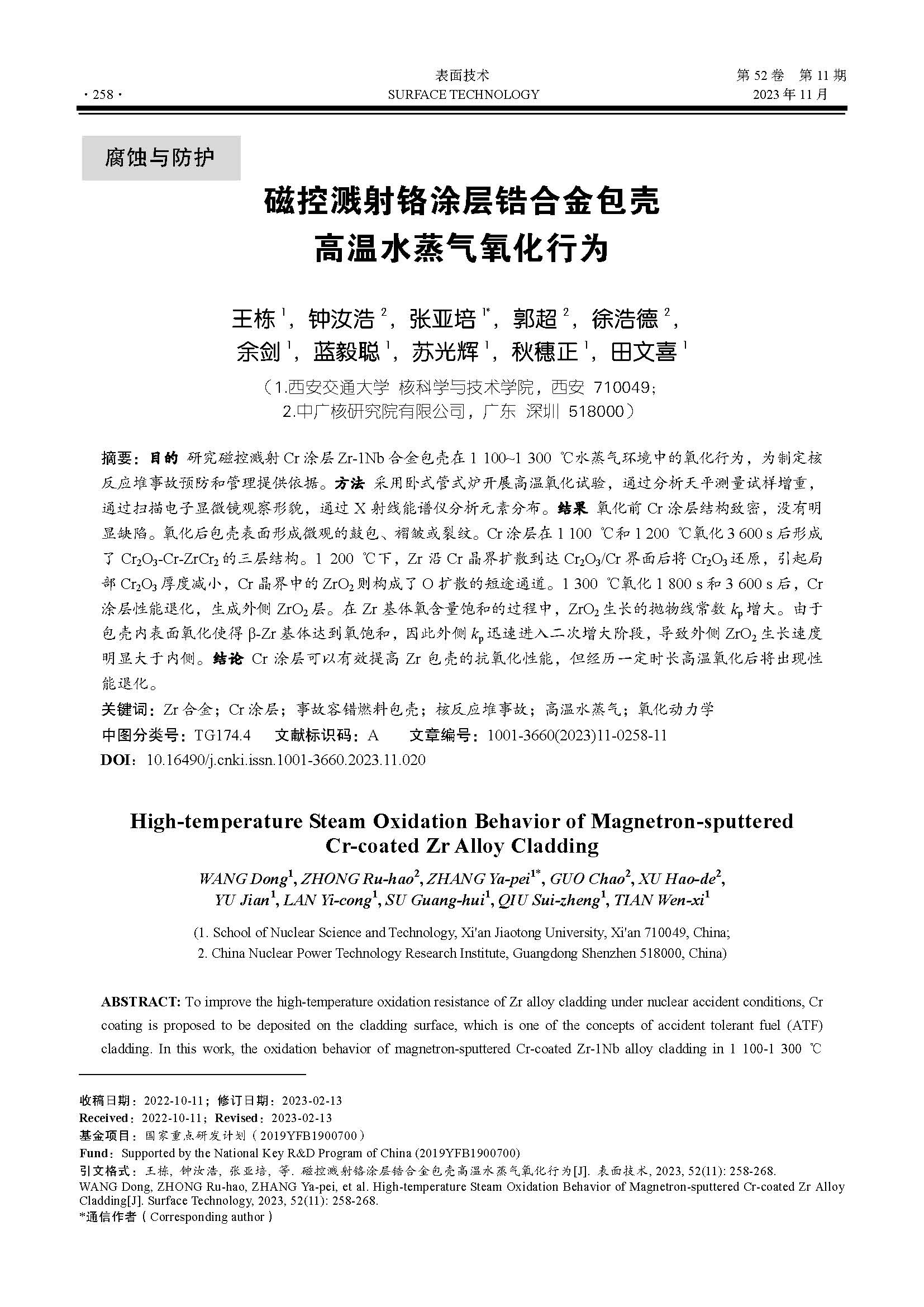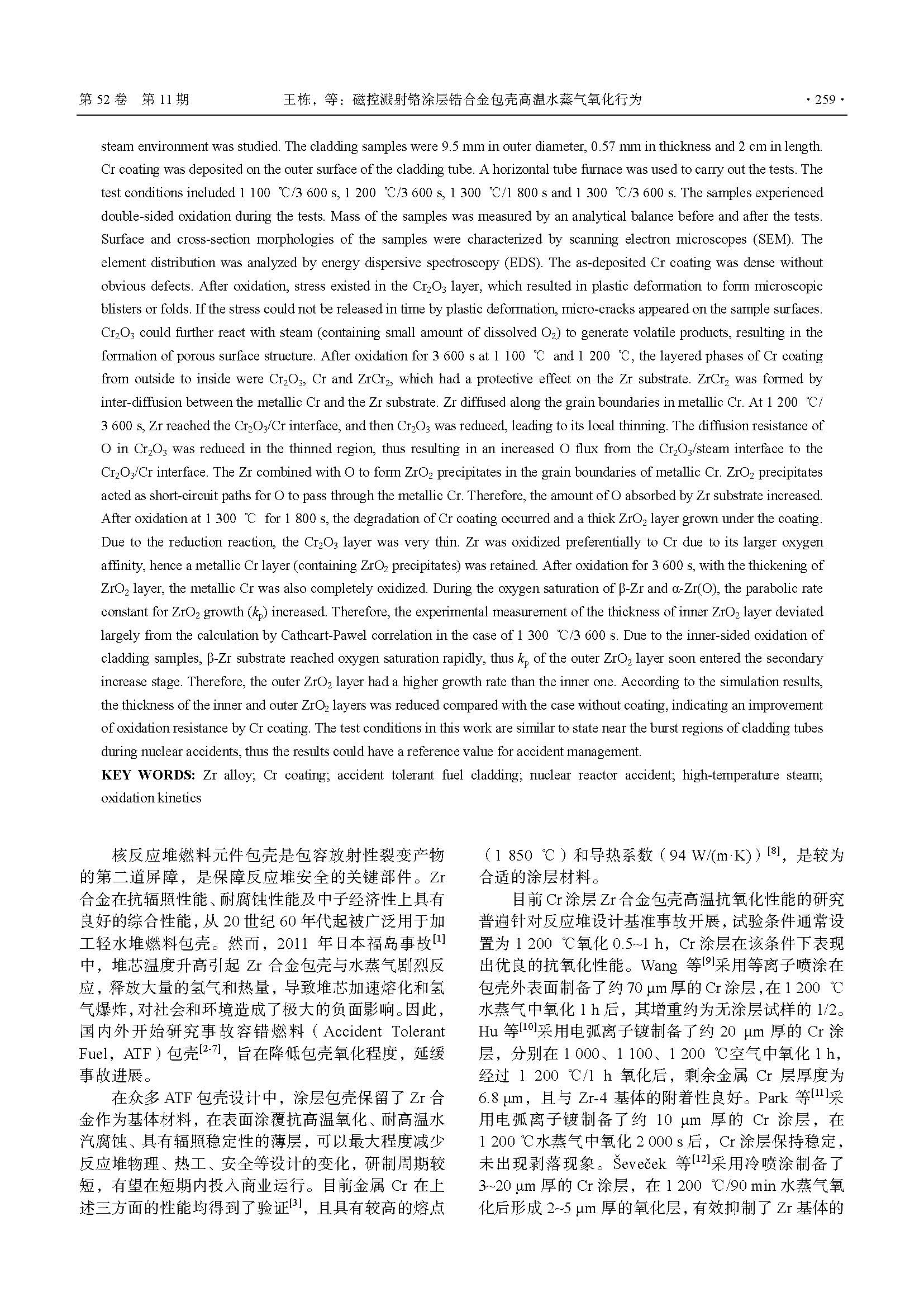 磁控溅射铬涂层锆合金包壳高温水蒸气氧化行为