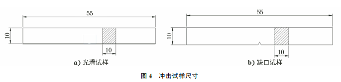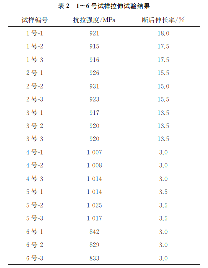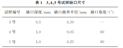 试验材料为Ti80合金板材,其组织主要为等轴α和板条α的双态组织(见图1)。为了研究不同表面质量和缺口尺寸对Ti80合金动态和静态力学性能的影响,对Ti80合金试样进行静态拉伸试验、动态冲击试验和疲劳试验,设计了6种试样形式,分别为:1号表面抛光试样;2号原始表面试样;3,4,5号缺口试样,缺口尺寸如表1所示;6号预制2mm裂纹试样。2号试样表面经过百叶轮打磨,取样保留了原始表面状态,其宏观形貌如图2所示。拉伸及疲劳试样尺寸如图3所示,冲击试样尺寸及缺口尺寸如图4,5所示。 使用电子材料试验机进行拉伸试验,试验前在试样的表面喷涂随机分布的散斑标点,通过视频引伸计对试样表面应变进行实时测量,试验速率为2mm/min。使用摆锤式冲击试验机进行冲击试验,试验过程可以采集力与位移信息,试样断裂后,利用双束扫描电子显微镜(SEM)观察试样断口形貌。使用电液伺服疲劳试验机进行疲劳试验,试验过程中使用载荷控制的模式进行加载,应力比为0.1,最大疲劳应力为680MPa,加载频率为6Hz。