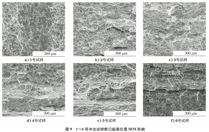 2.1 不同表面状态试样的拉伸试验 6种类型试样的拉伸试验结果如表2所示,应力-应变曲线如图6所示。 由表2和图6可知:1~6号试样的应力-应变曲线在弹性段范围内差异较小;缺口试样应力-应变曲线的斜率略有增大;1,2,3号试样的抗拉强度比较接近,断后伸长率依次减小;4,5号缺口试样的抗拉强度明显增大,表现出缺口强化效应,但是断后伸长率显著减小,约为光滑试样的20%;6号预制裂纹试样的抗拉强度最低,且断后伸长率也较低。 2号原始表面试样的抗拉强度升高是由表面硬化层导致,断后伸长率降低的原因是表面硬化层与划痕两种效果叠加使材料塑性减小。3号试样微小缺口产生的应力集中较小,对抗拉强度的影响并不明显,而该微小缺口可视为表面缺陷,影响其拉伸塑性变形能力,导致断后伸长率明显减小。4,5号试样缺口改变了缺口尖端的应力分布,呈现三轴应力状态,缺口试样的等效应力要小于光滑试样的等效应力,材料需承受更大的载荷才能断裂,因此展现出了更高的强度,又因为截面积变小会导致塑性变形集中,对于深缺口来说,其塑性变形能力显著降低。6号试样受裂纹尖端的束缚作用,塑性区域非常小,在试验过程中,试样提前断裂导致其抗拉强度及断后伸长率均显著减小。 2.2 拉伸试验过程中的应变分布 利用DIC观察整个拉伸试验过程中试样的全场应变情况,图7为1~6号试样断裂前的应变云图。由图7可知:1~3号试样的应变分布比较均匀,4~6号试样的应变则集中在缺口尖端位置,随着表面质量的下降及缺口深度的增大,试样破坏前的最大应变逐渐减小。钛合金具有良好的塑性变形能力,缺口试样能够通过塑性变形减小其缺口尖端应力集中的影响,抗拉强度则因为束缚导致的剪应力向正应力变化而增大。在试样的拉伸断裂过程中,三轴应力的作用方式使其最大力存在于试样心部,表面承受的正拉力小于内部的拉力峰值,当缺口尖端受塑性变形影响,应力集中系数降低到一定阈值以下时,该应力集中不会导致材料的抗拉强度降低。但当缺口应力集中系数过高,且束缚足够大时,其应变强化能力弱,使塑性变形对缺口尖端应力集中的缓解程度不足,导致试样提前断裂,抗拉强度降低。6号预制裂纹试样的应变比4,5号试样更加集中。 2.3 不同表面状态试样的冲击试验 6种类型试样的冲击试验结果如表3所示,冲击过程中的力-位移曲线如图8所示。 冲击试验过程中试样的受力类似于三点弯曲过程,最大力和最大塑性变形均产生在试样的表面,可以很好地反映表面状态对材料性能的影响。由图8可知:起裂后裂纹扩展速率较慢,以韧性断裂为主。1号光滑试样的冲击吸收能量最高,平均冲击吸收能量为382J,当试样表面存在打磨划痕时,冲击吸收能量会显著降低;2号试样的冲击吸收能量约为160J,下降幅度可达58%,对于缺口试样,随着缺口深度的增加,冲击吸收能量会进一步降低,当缺口深度相同时,随着缺口根部曲率半径的增大,5号试样的冲击吸收能量大于4号试样,表明钛合金材料的冲击吸收能量受其缺口尖端应力集中的影响。由于钛合金应变强化能力弱以及塑性扩展速率慢,在动态加载过程中,其应力集中几乎无法释放,导致材料的断裂扩展阻力非常小,相较于静态拉伸试验,冲击试验对试样的表面状态更为敏感。 1~6号冲击试样断口起裂位置SEM形貌如图9所示,所有试样断口表面均存在大量韧窝,表现为韧性断裂,即裂纹在整个断裂过程中都呈塑性扩展特征。1号试样的韧窝小而浅,断口较为平整,具有良好的塑性,而在2~6号试样断口表面发现了一些孔洞及二次裂纹,具有明显的撕裂脊,表明其断裂前承受了更大的变形,冲击性能相应较差。 2.4 疲劳试验 3种类型试样的疲劳试验结果如表4所示。 由表4可知:当施加的疲劳载荷相同时,光滑表面试样的寿命约为原始表面试样寿命的3倍,2号原始表面试样的寿命约为3号缺口试样寿命的8倍。随着试样表面质量的下降,其疲劳寿命会显著缩短,这是因为疲劳是一种动态损伤过程,其对应力集中效应非常敏感。当试样的表面存在加工划痕或缺口时,可以视为试样本身存在缺陷,疲劳试验过程中,应力会在试样表面的缺陷处集中,导致该区域的局部应力大大增加,并且钛合金自身塑性变形速率较慢,因此材料在疲劳加载最初的过程就开始快速损伤,当损伤累积到材料的最大使用阈值时,试样会被破坏。 采用不同表面状态试样的力学性能指标除以表面抛光试样的力学性能指标作为表面敏感性系数,以此评价不同表面状态对Ti80合金力学性能的影响。不同表面状态试样的表面敏感性系数如图10所示,不同表面状态试样静态拉伸试验的表面敏感性系数为0.9~1.1,浮动范围较小,而对于动态冲击试验和疲劳试验,即使是表面打磨态及微小缺口,也会使表面敏感性系数显著下降,6号冲击试样的表面敏感性系数仅为0.1,3号疲劳试样的表面敏感性系数仅为0.08。对比拉伸、冲击、疲劳试验可以看出,不同表面状态试样的力学性能对动态加载过程更为敏感。