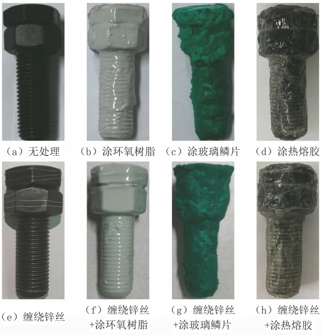 为了比较了三种涂层及其耦合锌丝使用前后的防腐蚀效果,对螺栓进行了如下防腐蚀处理:仅涂覆防腐蚀涂层,仅缠绕锌丝,缠绕锌丝并涂覆防腐蚀涂层。防腐蚀处理后的螺栓如图2所示。