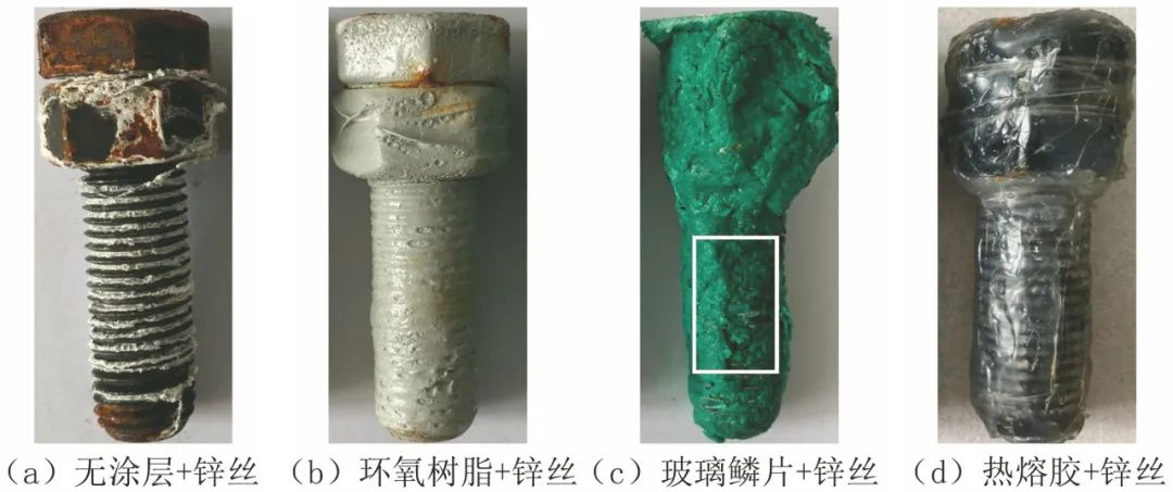 图8 盐雾腐蚀72小时后不同防腐蚀涂层+锌丝螺栓的宏观形貌