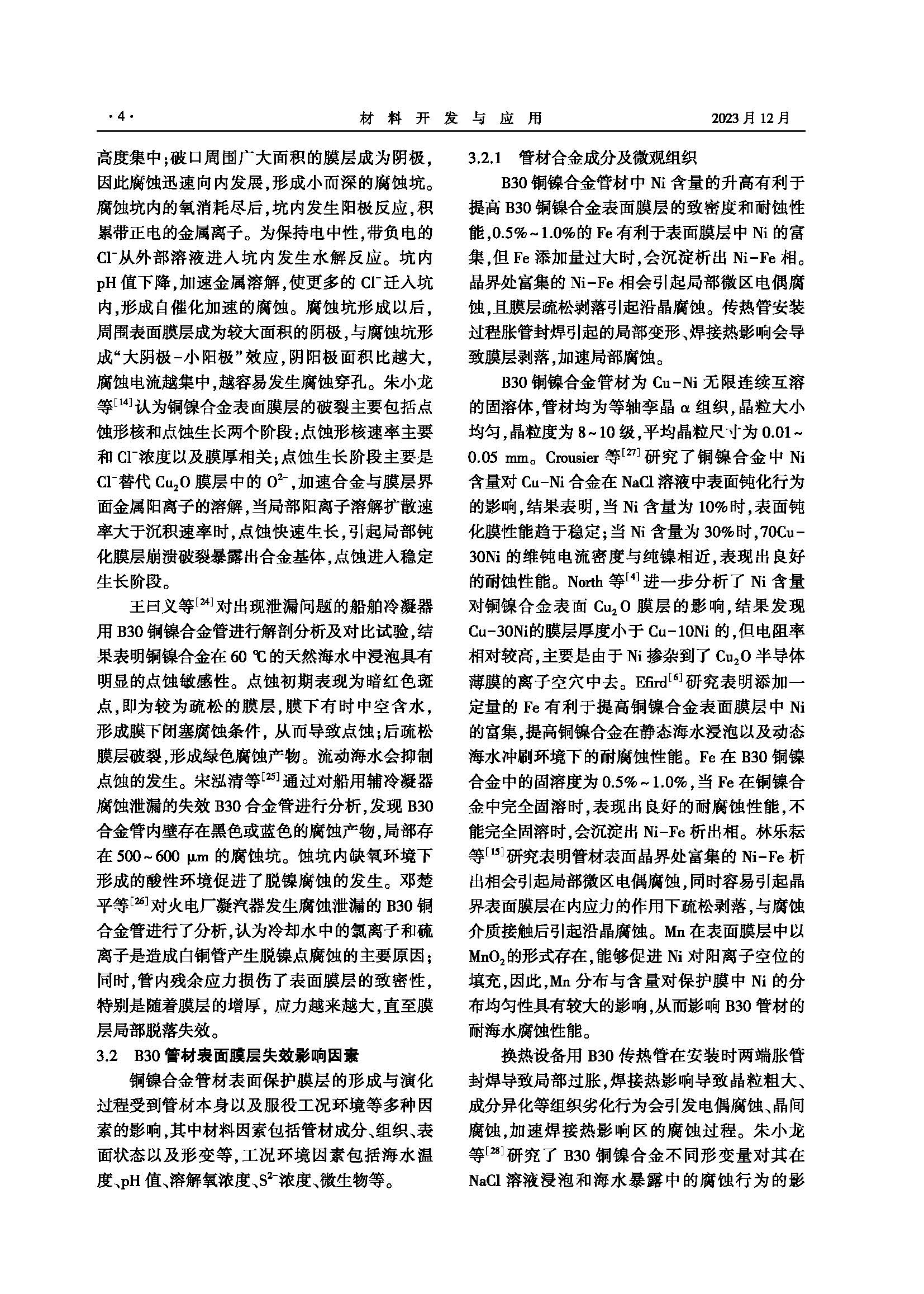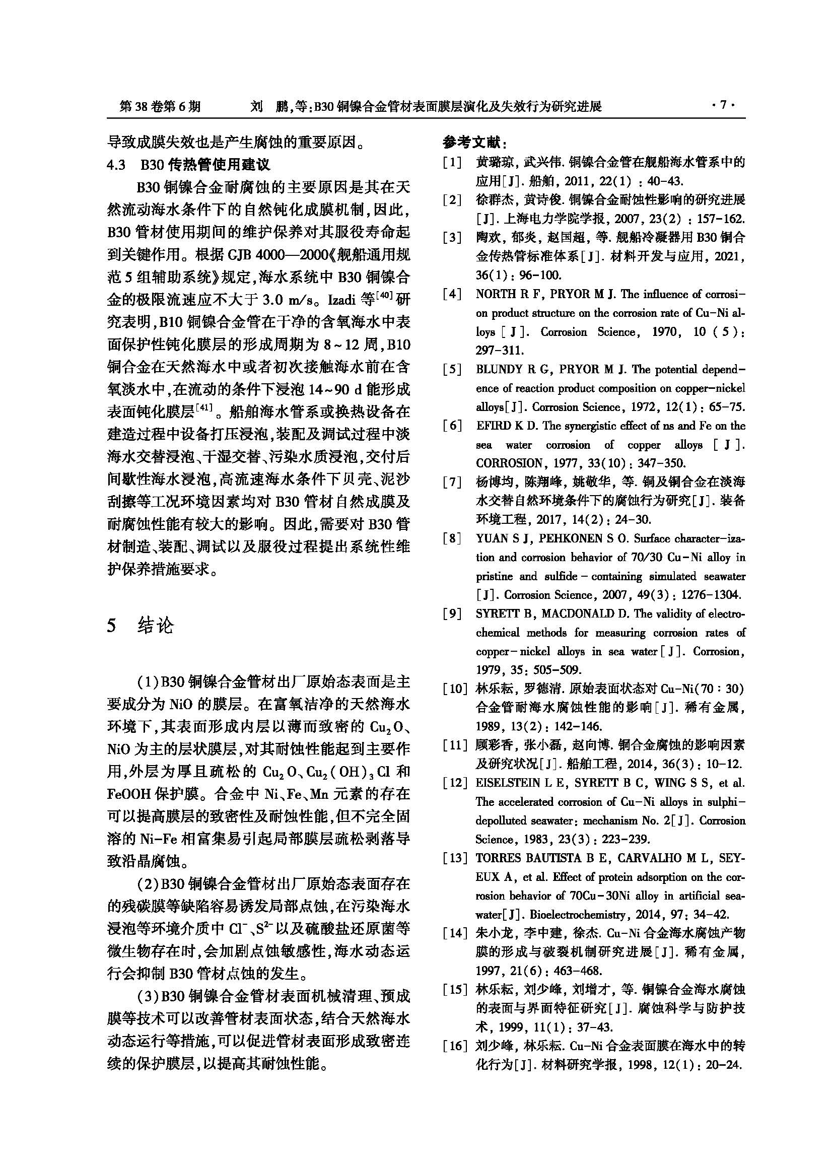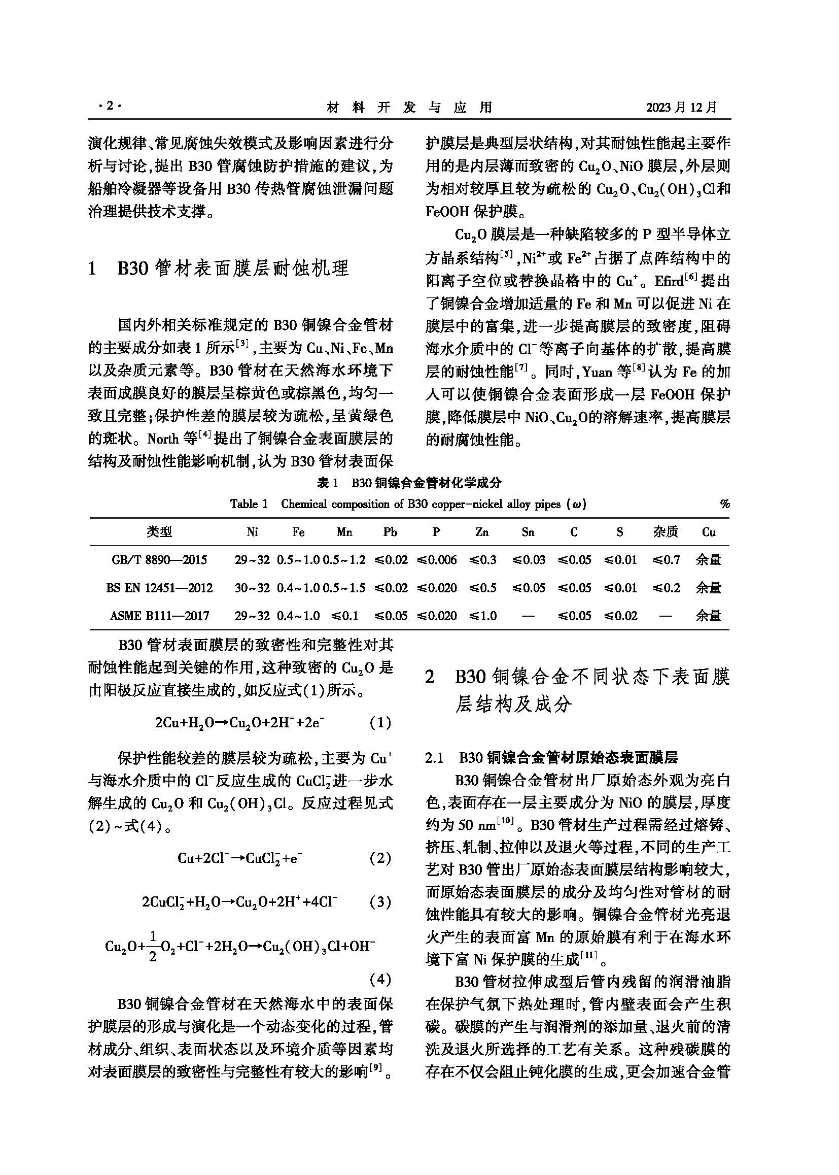 B30铜镍合金管材表面膜层演化及失效行为研究进展