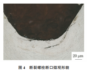 将断裂螺栓沿纵向剖开,机械抛光后用三氯化铁溶液腐蚀。采用光学显微镜观察,在螺纹根部发现裂纹(见图4)。螺纹附近有明显金属变形痕迹,说明螺纹是采用滚压方式制造的。裂纹延伸方向与金属流动变形方向一致,推断裂纹是在螺纹加工时产生的。对同批次未使用的螺栓进行外观检查,发现多处明显加工裂纹缺陷,最大长度为1.8mm。因此,可以判断断裂螺栓根部裂纹是在螺纹滚压搓丝过程中产生的。