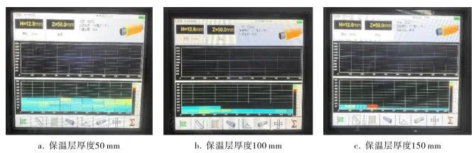 采用OktantaPE4332型脉冲涡流检测仪,对现场带有保温层的低温管道进行管壁测厚和缺陷评估,结果如图3所示。可以看出当保温层厚度在100 mm以下时,检测数据较稳定,可以有效扫查管道壁厚;当保温层厚度在100~150 mm时,试验数据不稳定,出现跳跃点;当保温层厚度达到200 mm以上时,则无法进行检测。