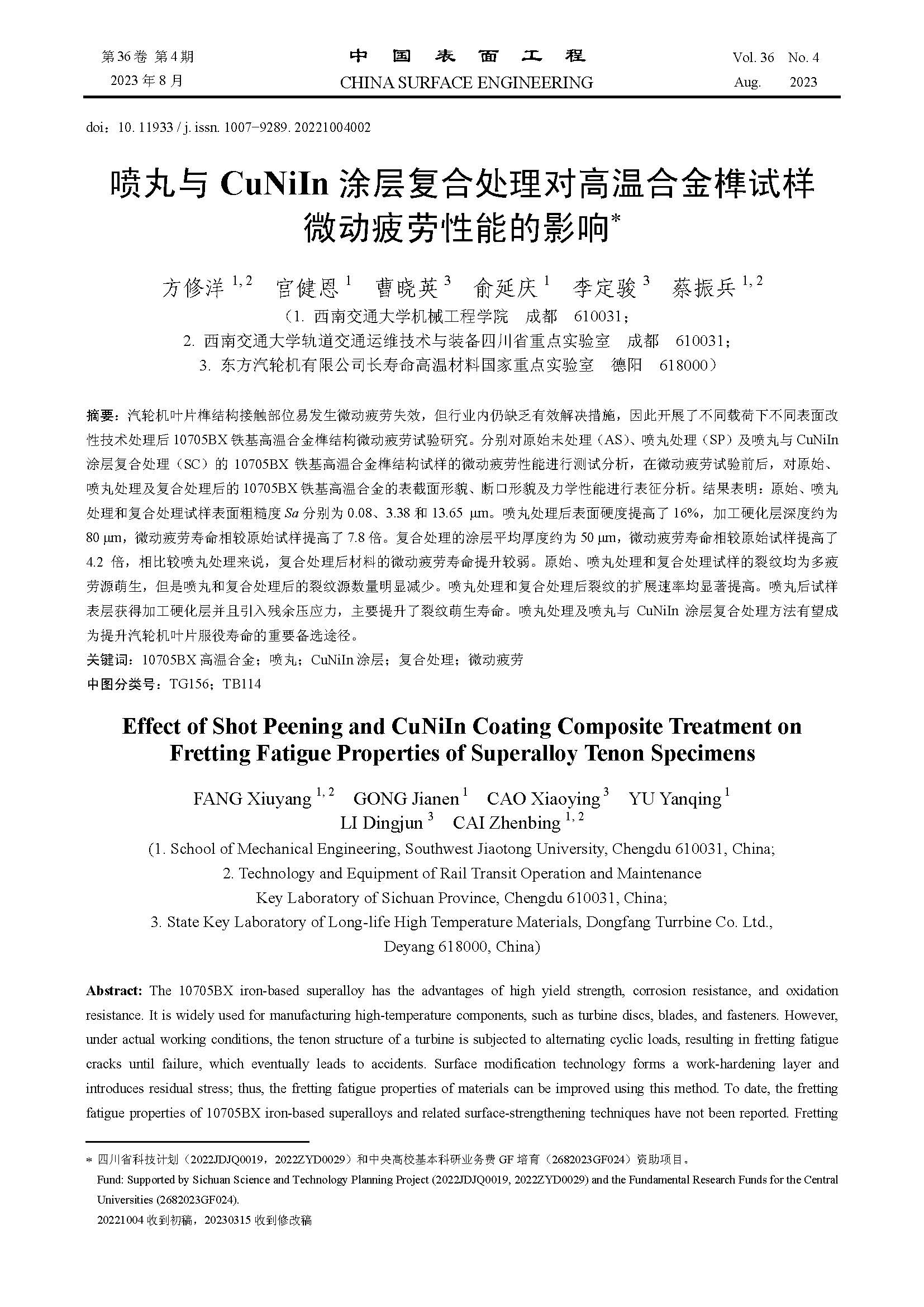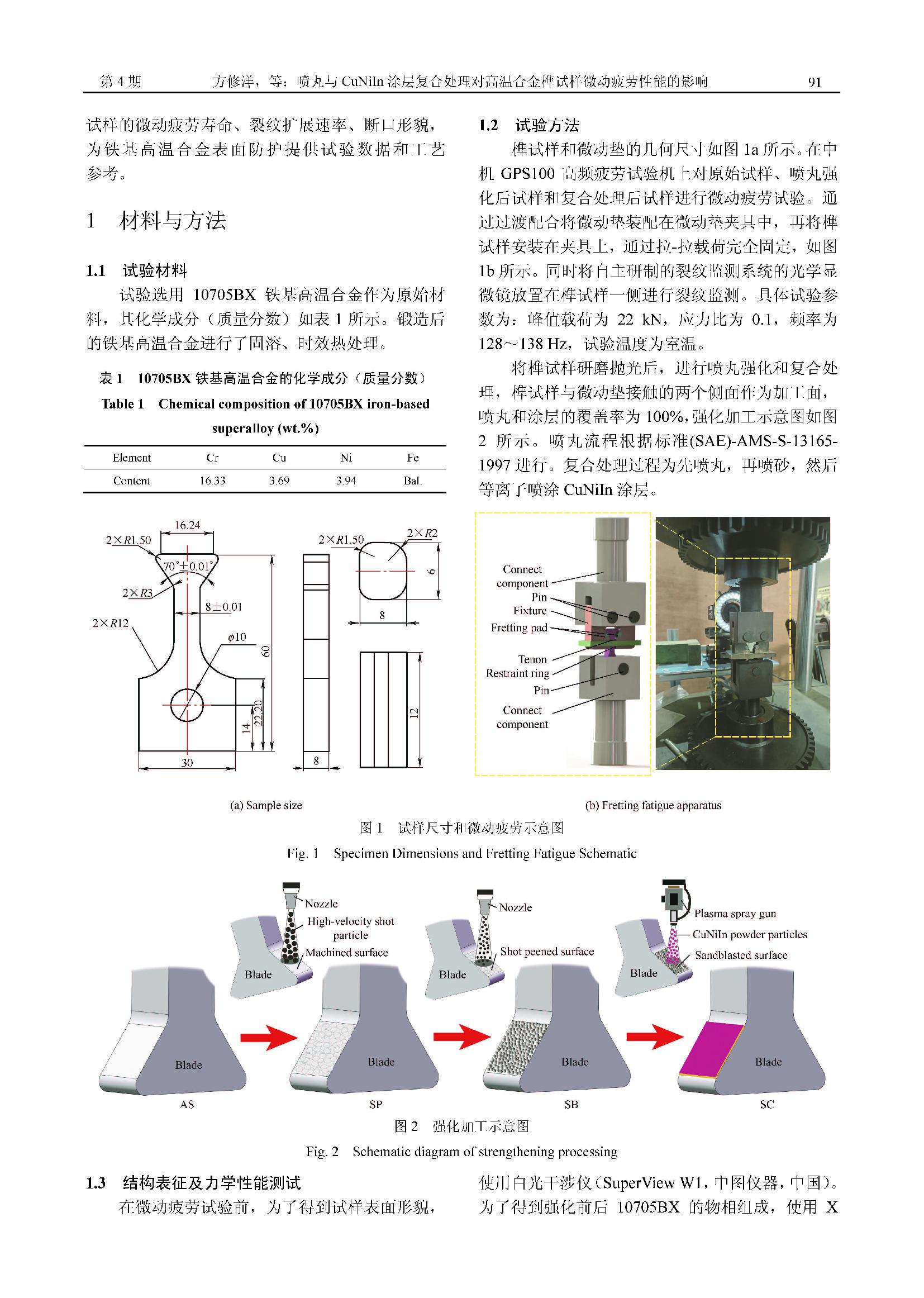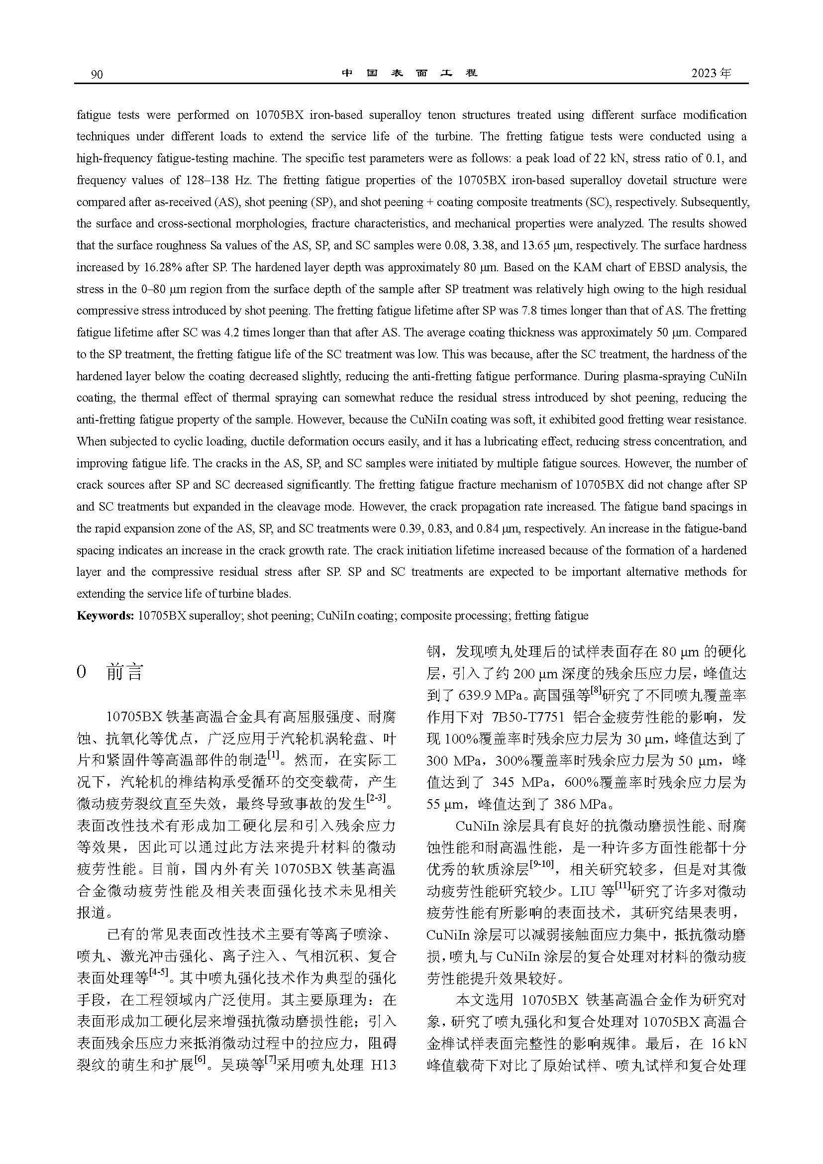 标签: 10705BX高温合金, 喷丸, CuNiIn 涂层, 复合处理, 微动疲劳