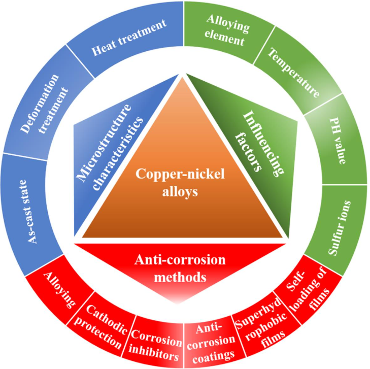 研究表明铜镍合金在海水中有良好的耐蚀性与铜镍合金表面形成的腐蚀产物有关,在相同的腐蚀介质 条件下,合金抵御冲刷腐蚀的能力主要取决于自身的力学性能和表面的钝化膜结构。为了提高铜镍合金耐 腐蚀的能力,现有途径主要包括合金化法、牺牲阳极的阴极保护法、缓蚀剂的应用、防腐涂料、超疏水膜技 术、自组装单分子膜技术等。
