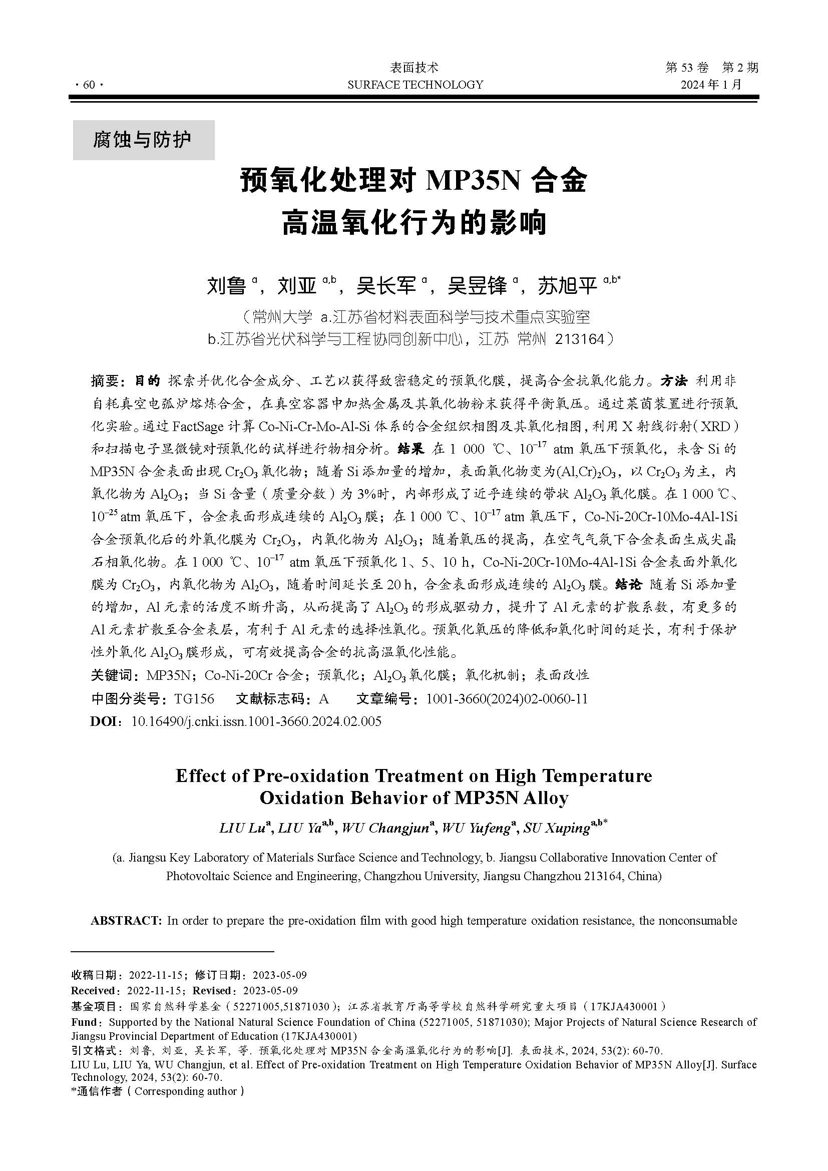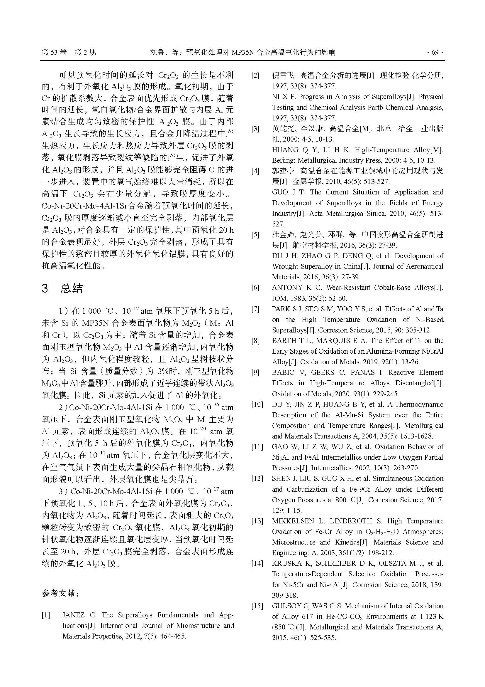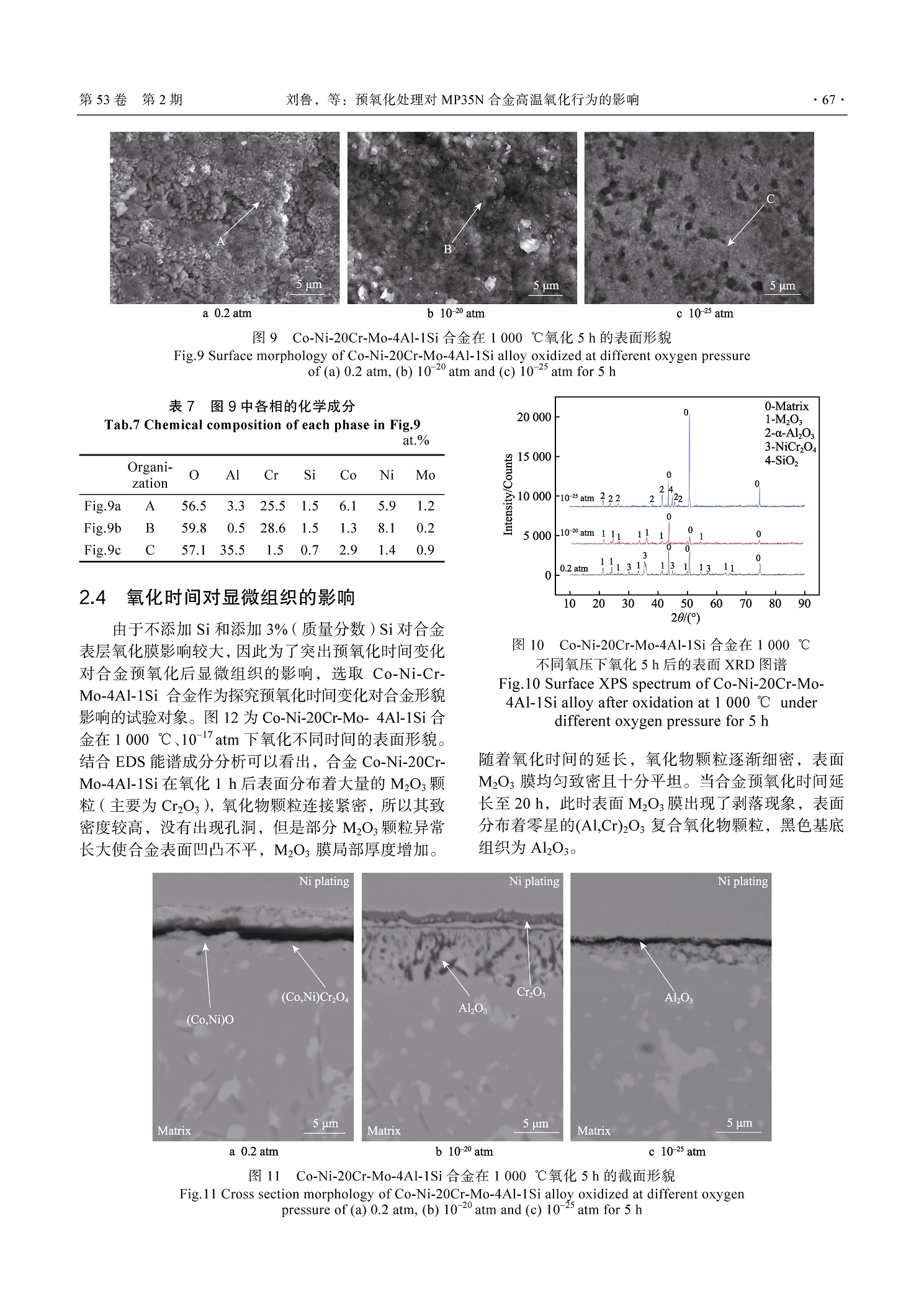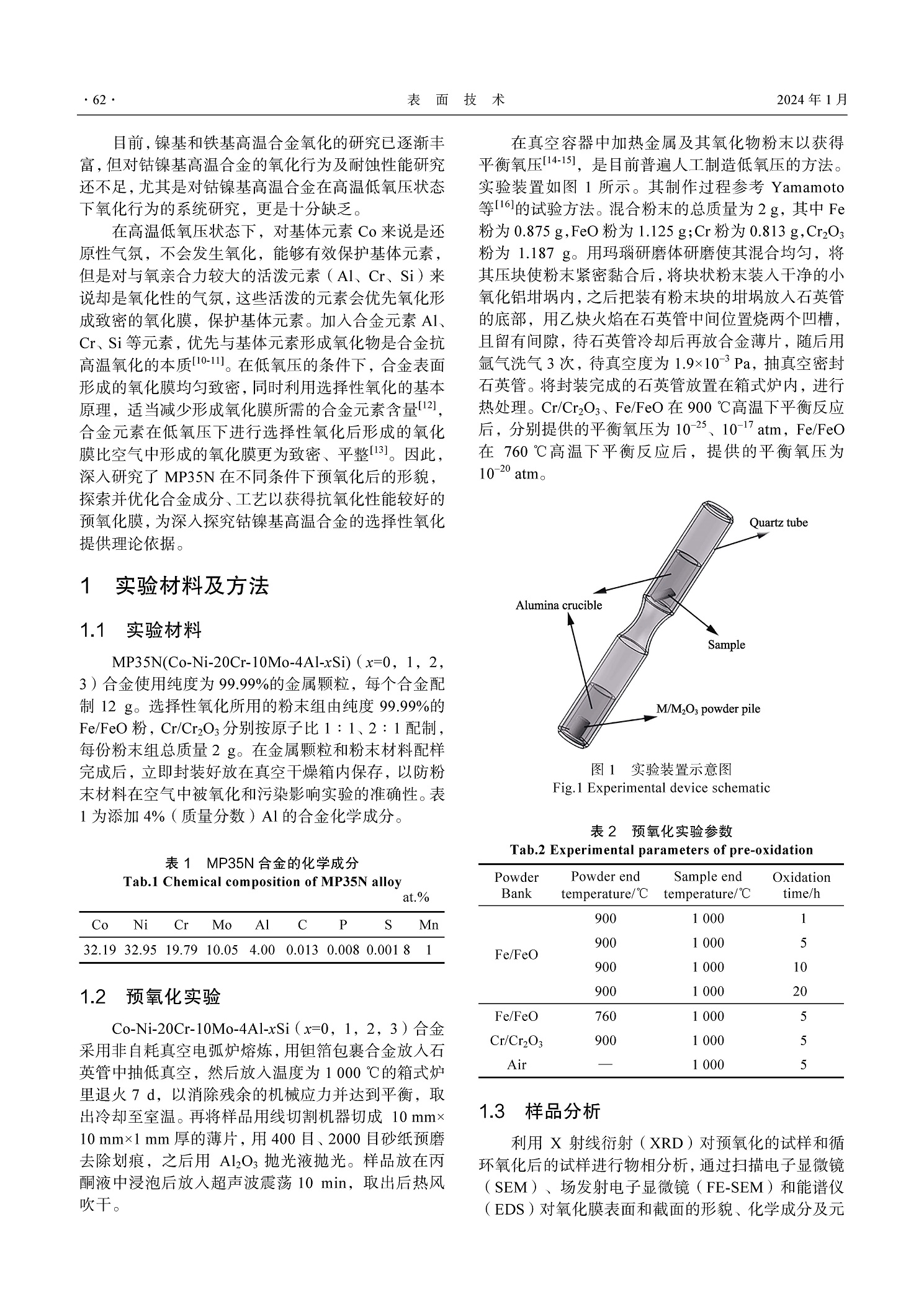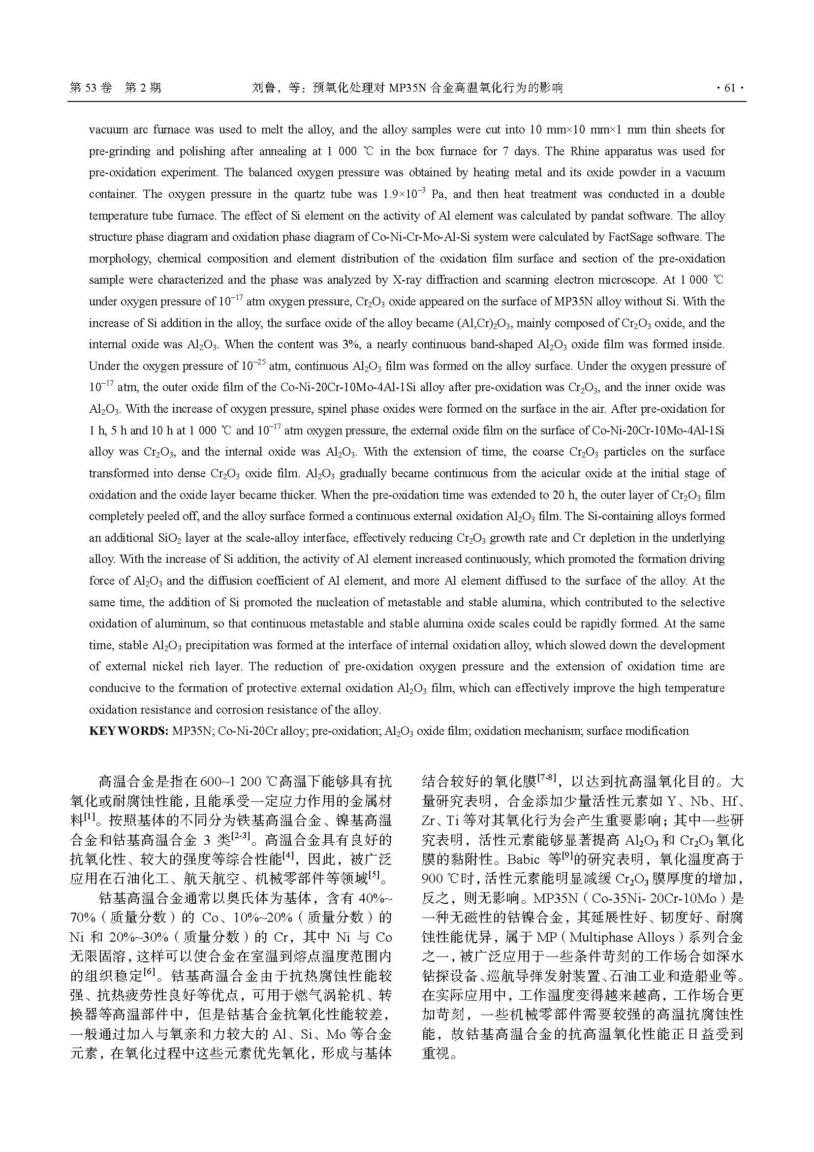预氧化处理对 MP35N 合金 高温氧化行为的影响