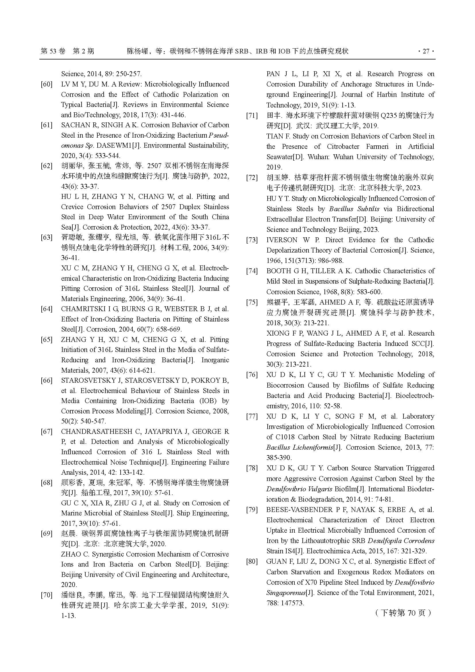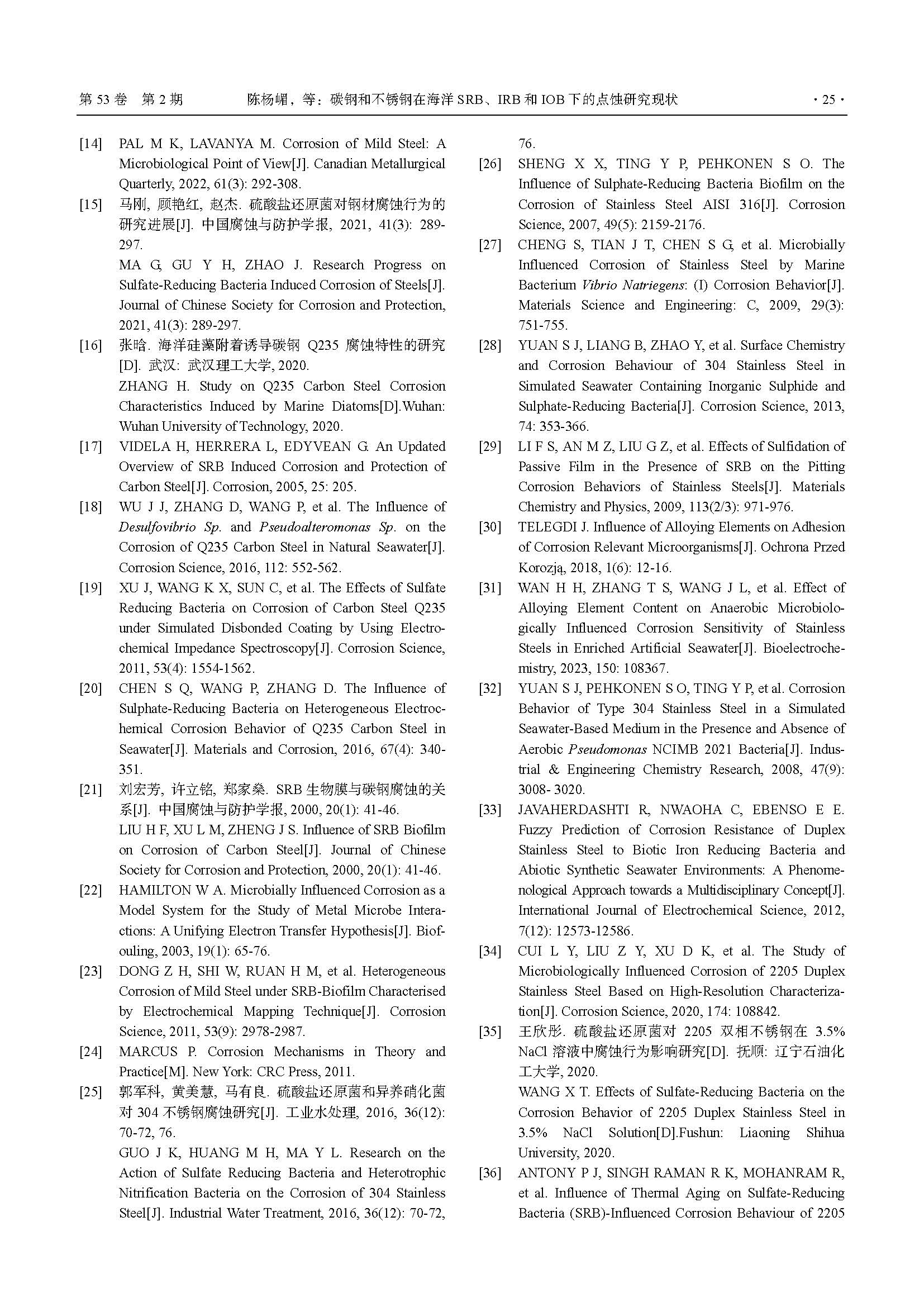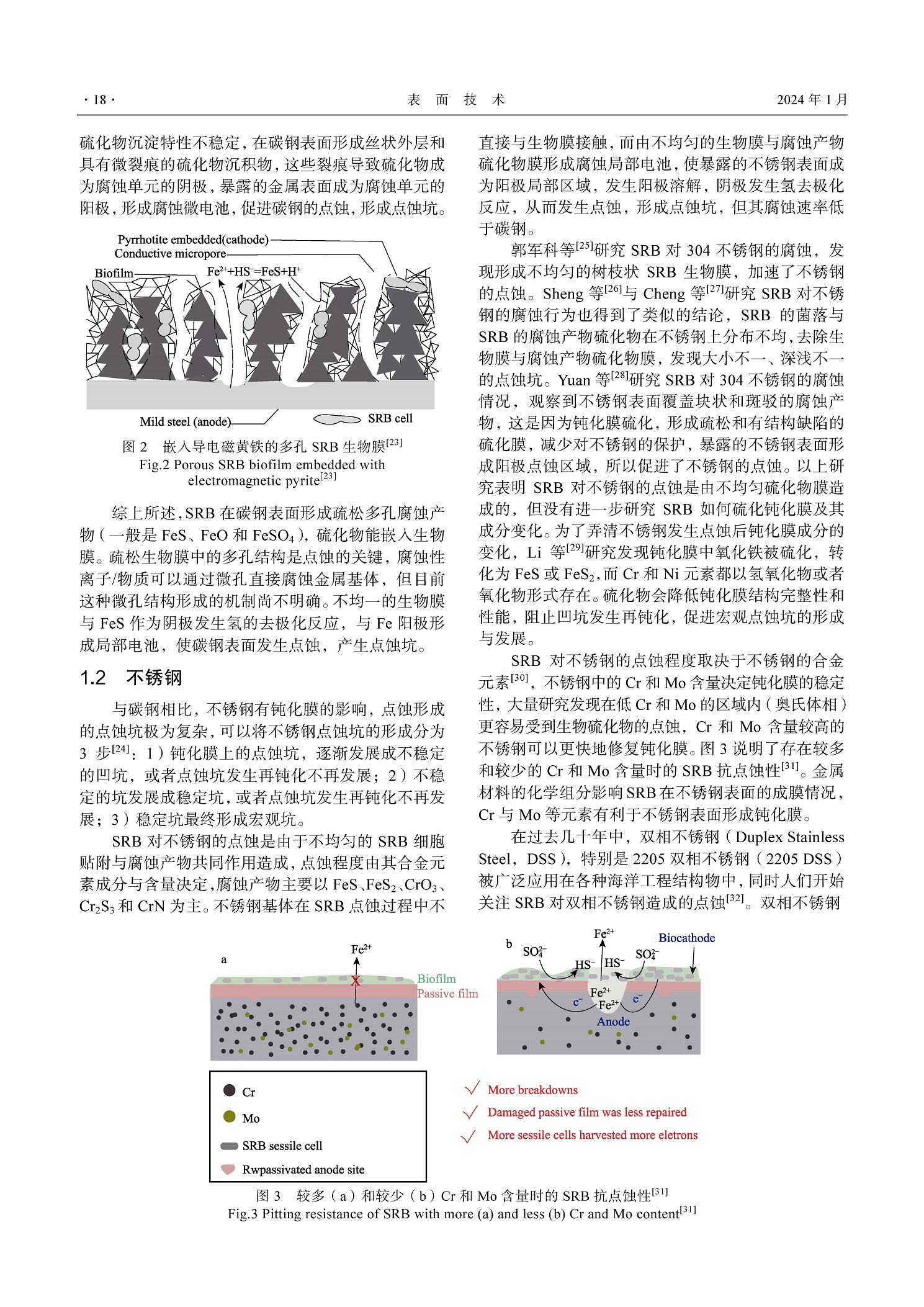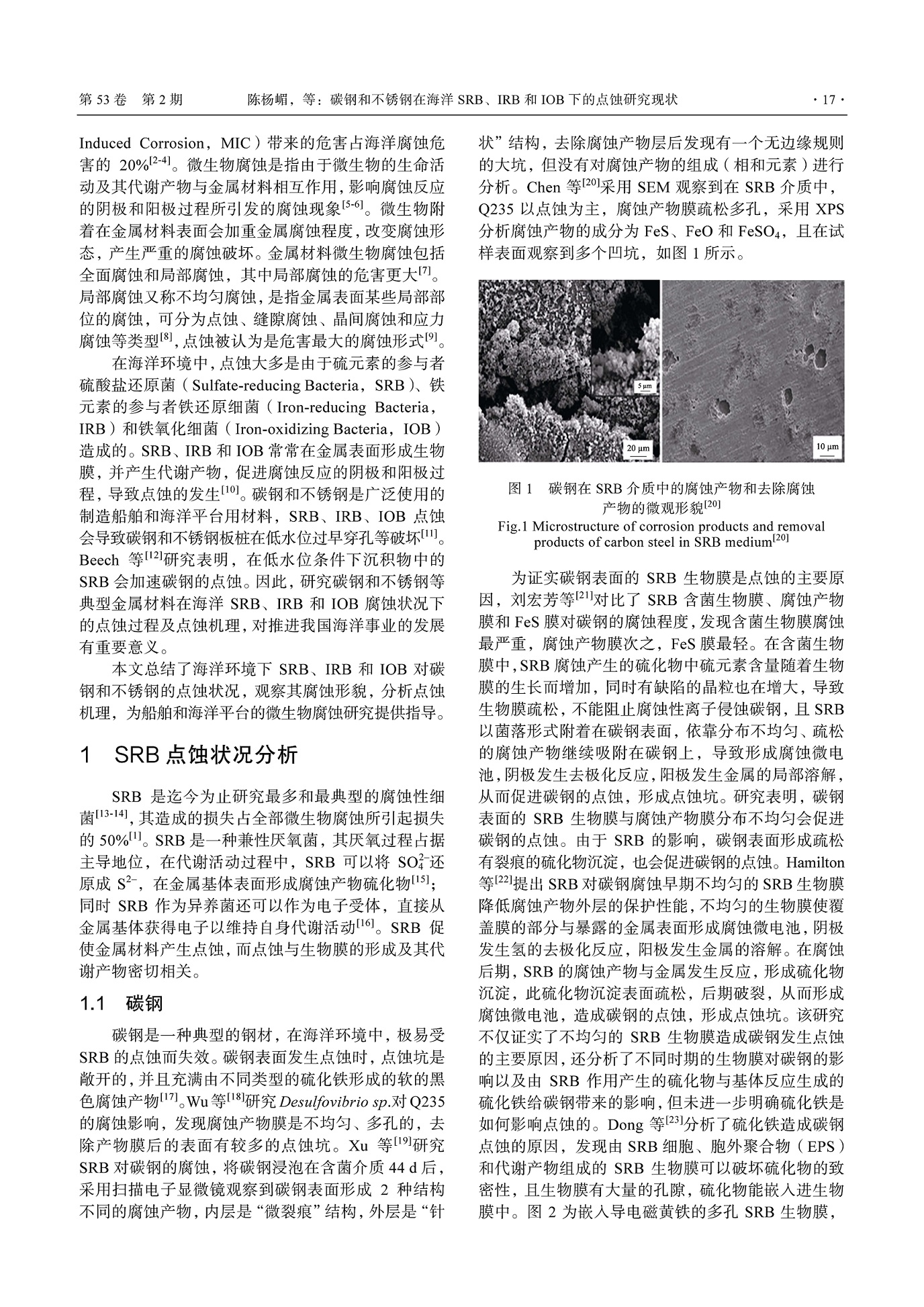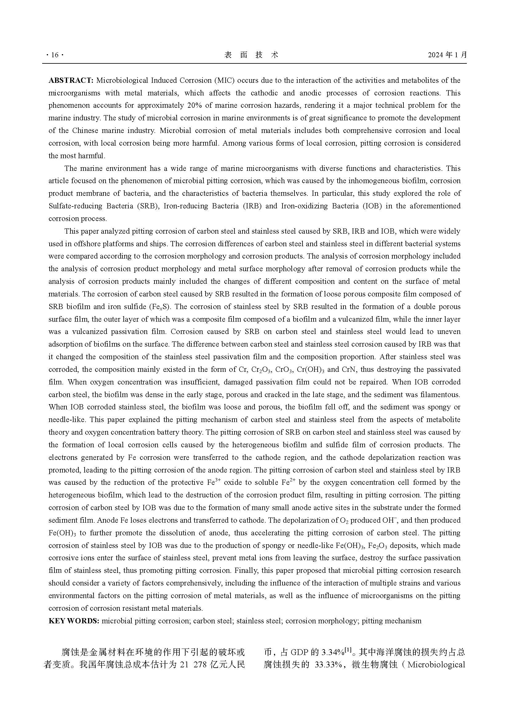 碳钢和不锈钢在海洋 SRB、IRB 和 IOB 下的点蚀研究现状