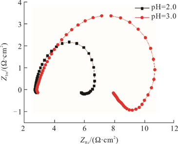 Deng等采用电化学方法研究了不同pH值对X80钢冲蚀行为的影响,发现随着pH值的增加,X80钢的自腐蚀电位负移,腐蚀电流密度呈逐渐减小的趋势,阻抗谱图的电容和电阻弧半径逐渐增大,总极化电阻增大,腐蚀速率降低,耐蚀性提高(图5)。