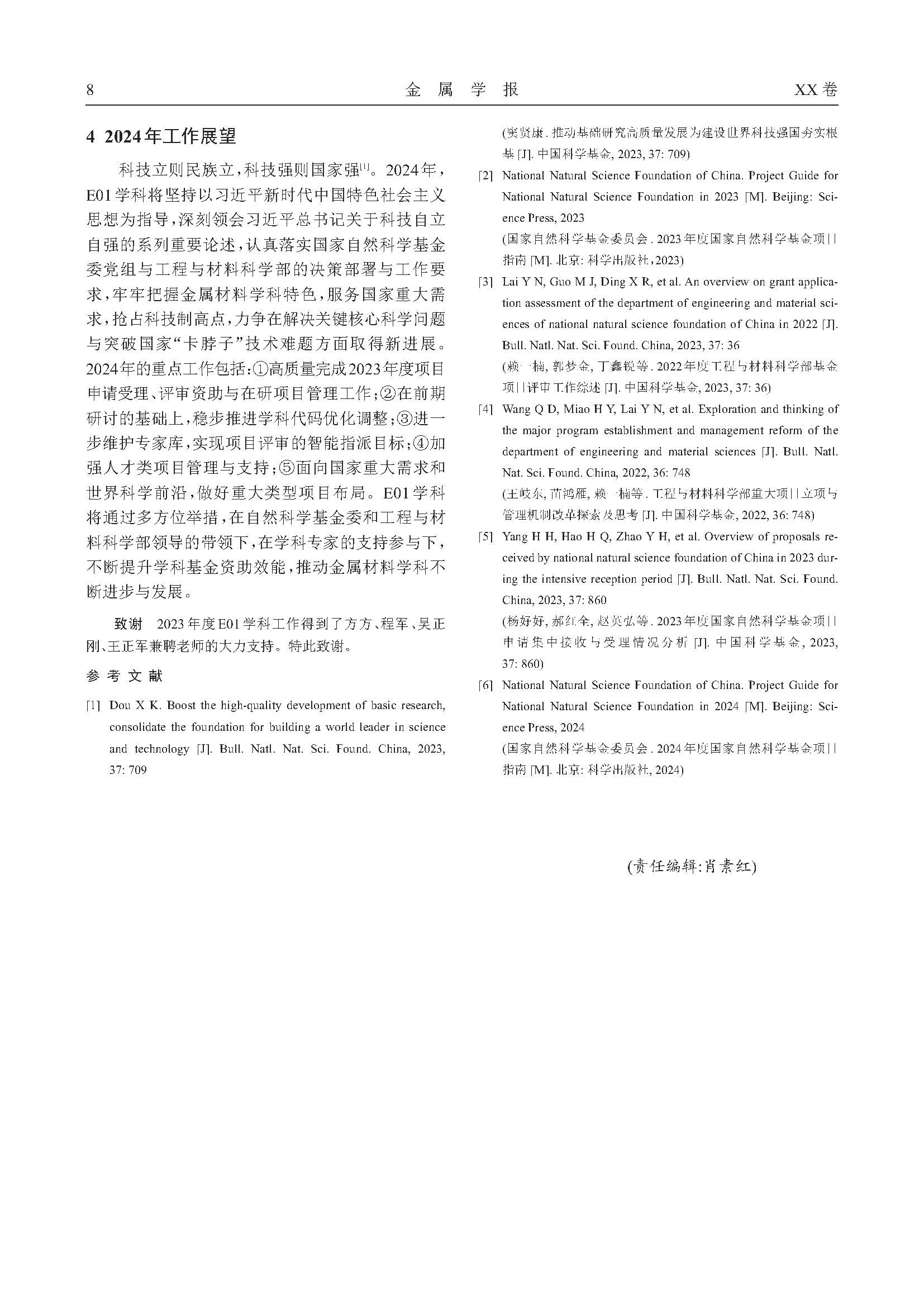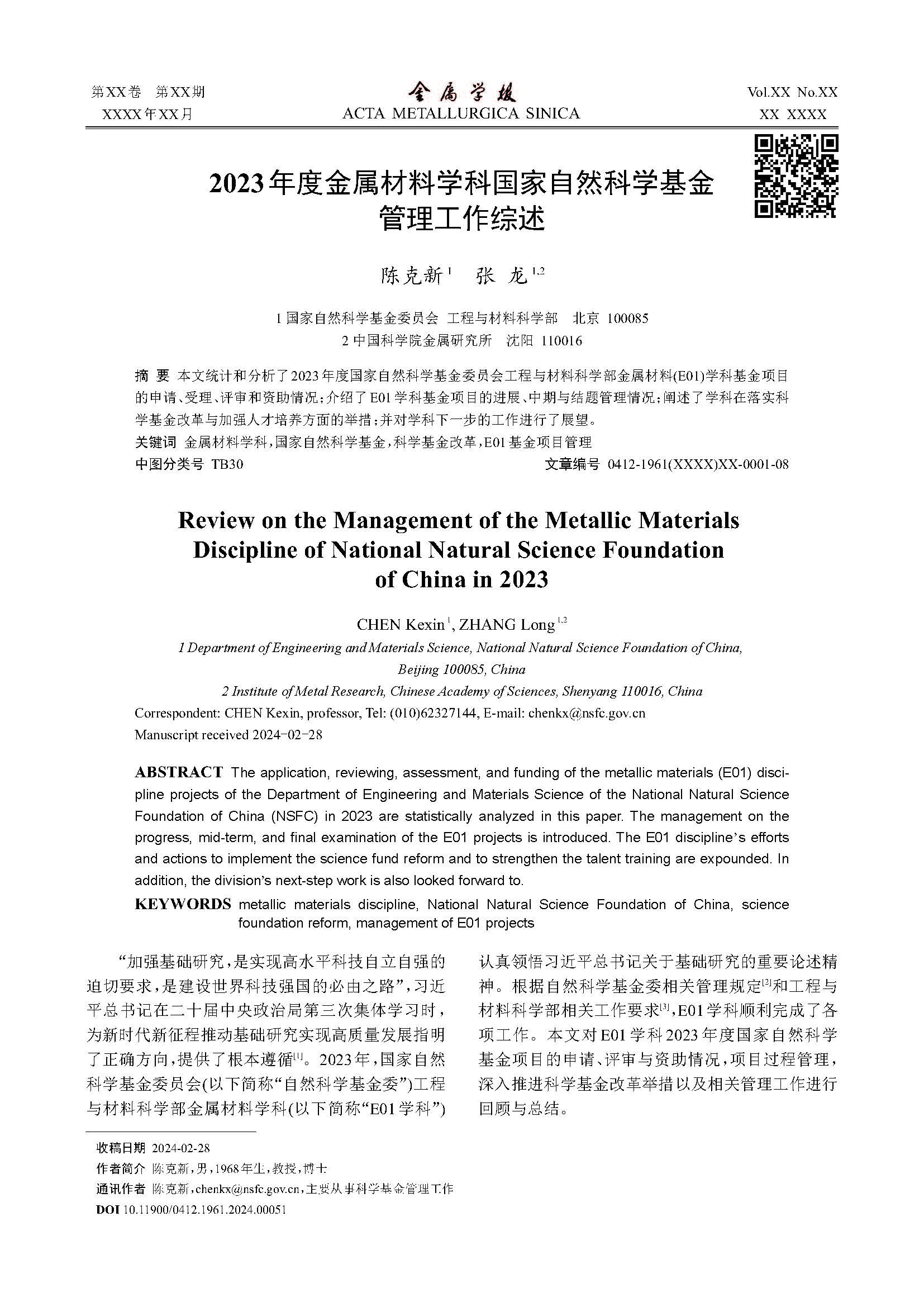 2023年度金属材料学科国家自然科学基金管理工作综述