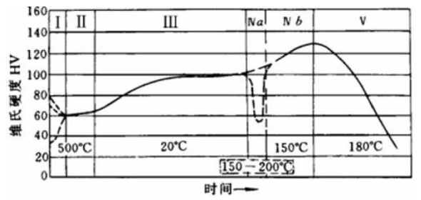 I—原始状态;II—固溶状态;III—自然时效(GP区);IVa—在150~200℃回归处理(GP区重溶);IVb—人工时效(θ”+θ'相);V—过时效(θ”+θ'相)