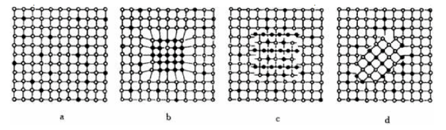 图a. 淬火状态,为单相α固溶体,铜原子(黑圆点)均匀分布;图b. 时效初期,形成GP区;图c. 时效后期,形成半共格的过渡相;图d. 高温时效,析出非共格的平衡相