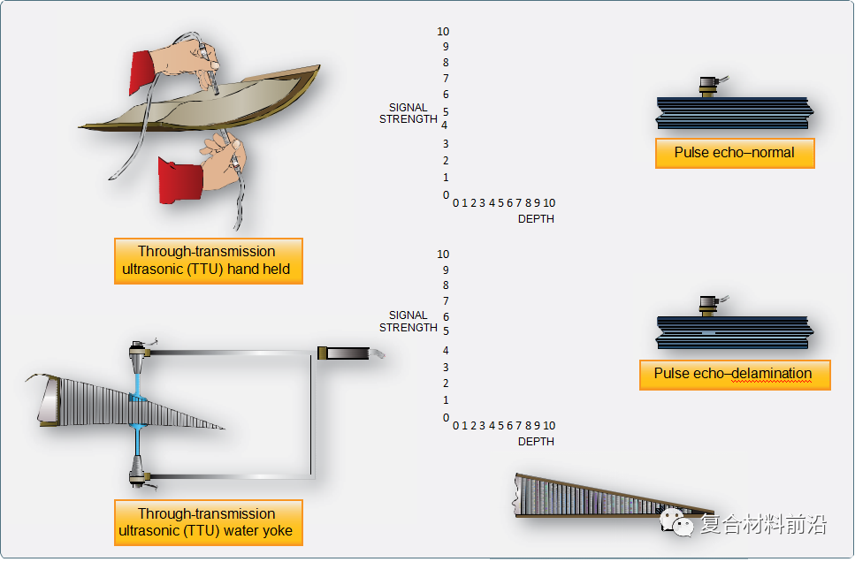 这是目前应用最广泛的无损检测方法。超声检测(UT)的工作原理是将高频(0.5~25 MHz)能量波发送到层压板中,捕捉并量化这些波形的振幅和飞行时间,从而分析了解材料性能和结构变化。使用的主要方法有两种: