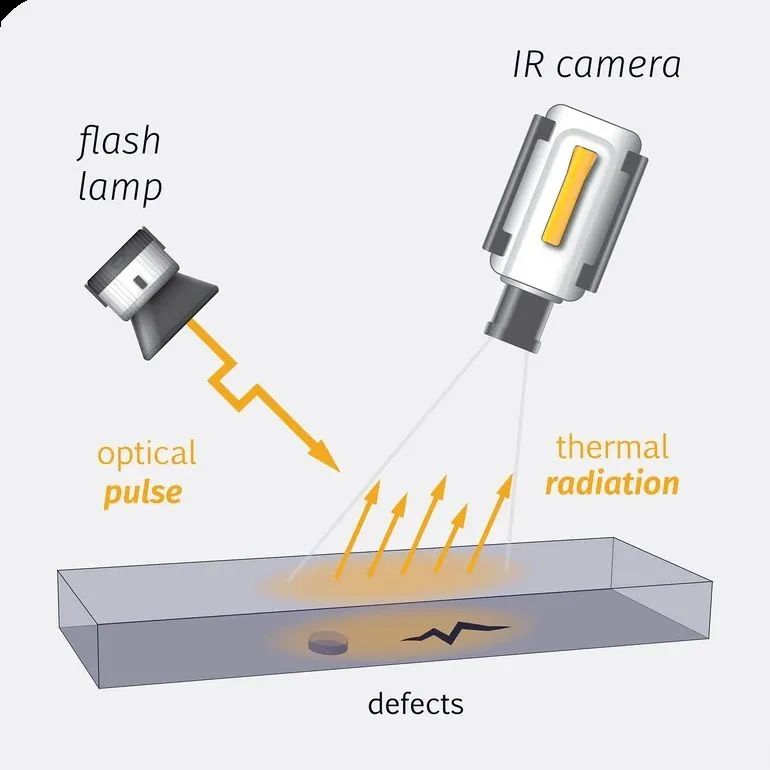 脉冲红外热成像的工作原理是利用主动加热技术,通过红外热成像系统自动记录试件表面缺陷和基体材料由于不同热特性引起的温度差异,进而判定被测物表面及内部的损伤。