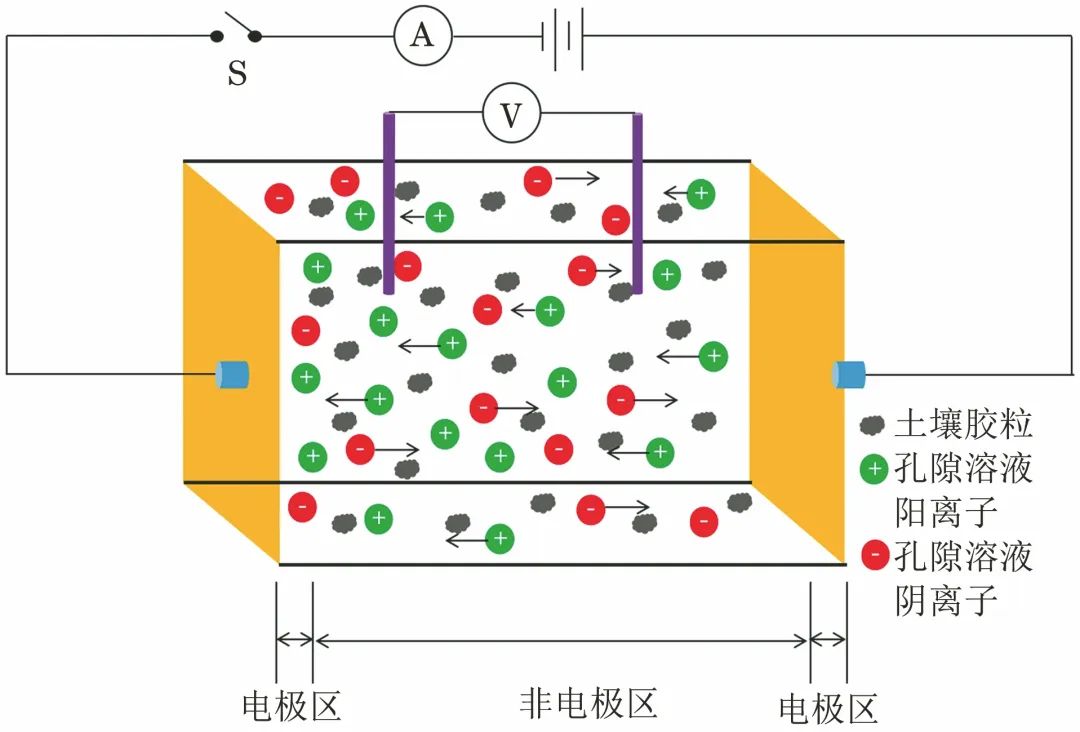 为了便于理解,将土壤箱中的土壤分为电极区和非电极区。电极区的电极反应使得该区域孔隙溶液的离子浓度增大,通过电迁移和扩散作用向非电极区移动;非电极区内,孔隙溶液离子在外电场的作用下定向移动至电极区;土壤胶粒则在外电场作用下发生夹层极化效应。