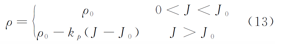 由以上内容可知,在交流电作用下,土壤电阻率同样呈现一种非线性变化的特性,与直流电模型相比,差异在于无电阻率升高的区段,可近似用图8和式(13)所示模型进行表征,其中J0为电阻率下降区段的起始交流电流密度,与土壤含水率有关。