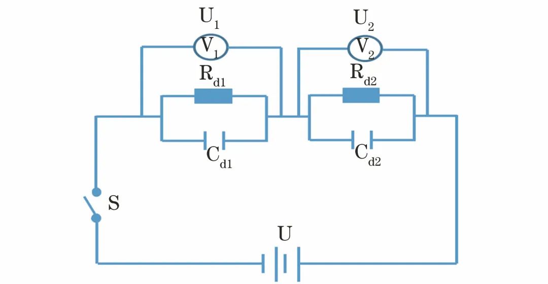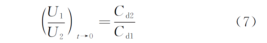 当开关S闭合瞬间(t→0),电压从0迅速上升至U,电阻支路相当于开路,此时两层电介质上的电压与电容成反比,见式(7):