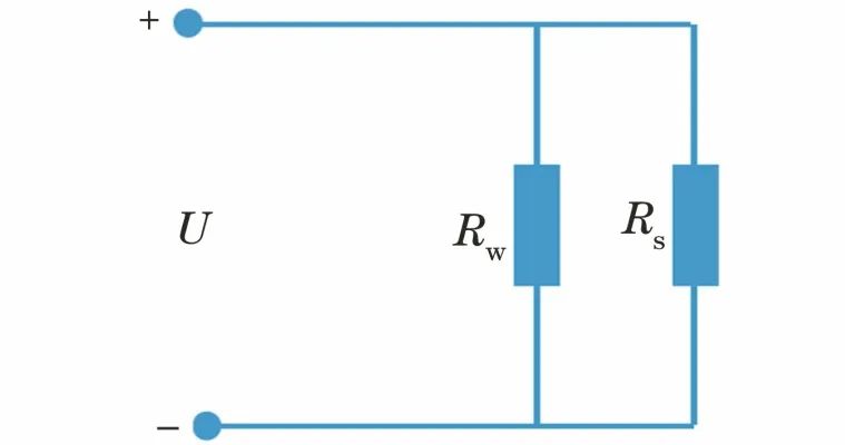 WAXMAN等在第一种和第二种导电途径的基础上,考虑了土壤颗粒表面的导电影响,假设土壤导电路径由孔隙水液相导电和固体颗粒导电路径并联而成,其等效电路如图2所示,其中,RW表示孔隙水液相导电路径电阻,RS表示固体颗粒导电路径电阻。