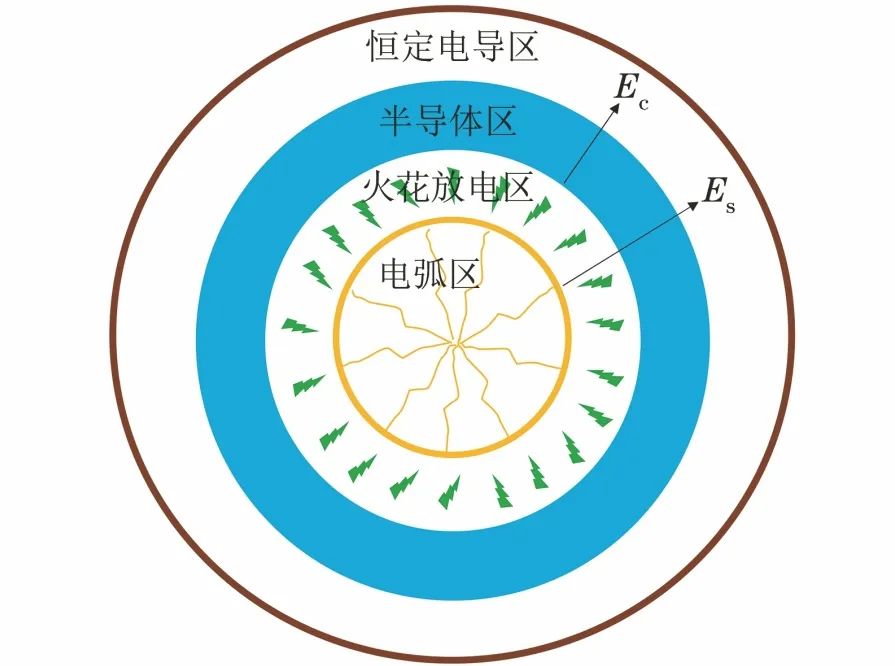 雷电流经杆塔接地系统向土壤中散流时,接地装置周围土壤中的电流密度急剧升高,电场强度随之增大,当大地中的电场强度超过一定值,但还没有达到土壤的临界击穿强度时,土壤电阻率随电场强度的增加而下降,当冲击电流继续增大使得土壤中电场强度超出临界击穿强度Ec时,在接地体的周围出现存在土壤电离现象的火花放电区域;随着冲击电流强度进一步增大,土壤中的电场强度大于临界电弧放电强度Es,此时火花区域区域逐步发展为沿着不规则土壤颗粒表面的离散电弧通道,形成电弧区,即在雷电流作用下,接地装置周围的土壤中会产生如图9所示的4个区域:电弧区、火花放电区、半导体区和恒定电导区。