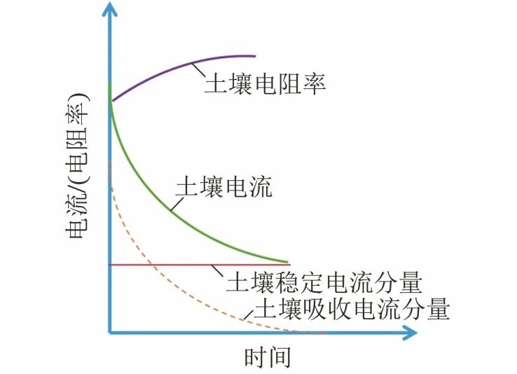 值得注意的是,由于土壤不均匀性,土壤中存在多层电介质,土壤在直流电作用下存在显著的极化和吸收现象,众所周知,采用Wenner四电极法测量土壤电阻率时,不宜采用直流电源以避免电极极化导致的测量误差,实际上除了电极极化,土壤自身的极化现象也不容忽视,这主要是土壤中多层电介质的夹层极化。