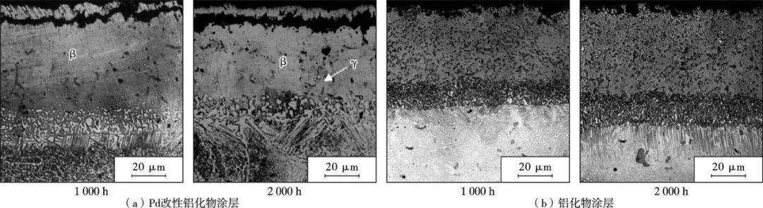 900 ℃下等温氧化1 000,2 000 h简单铝化物涂层与Pd改性铝化物涂层的微观结构