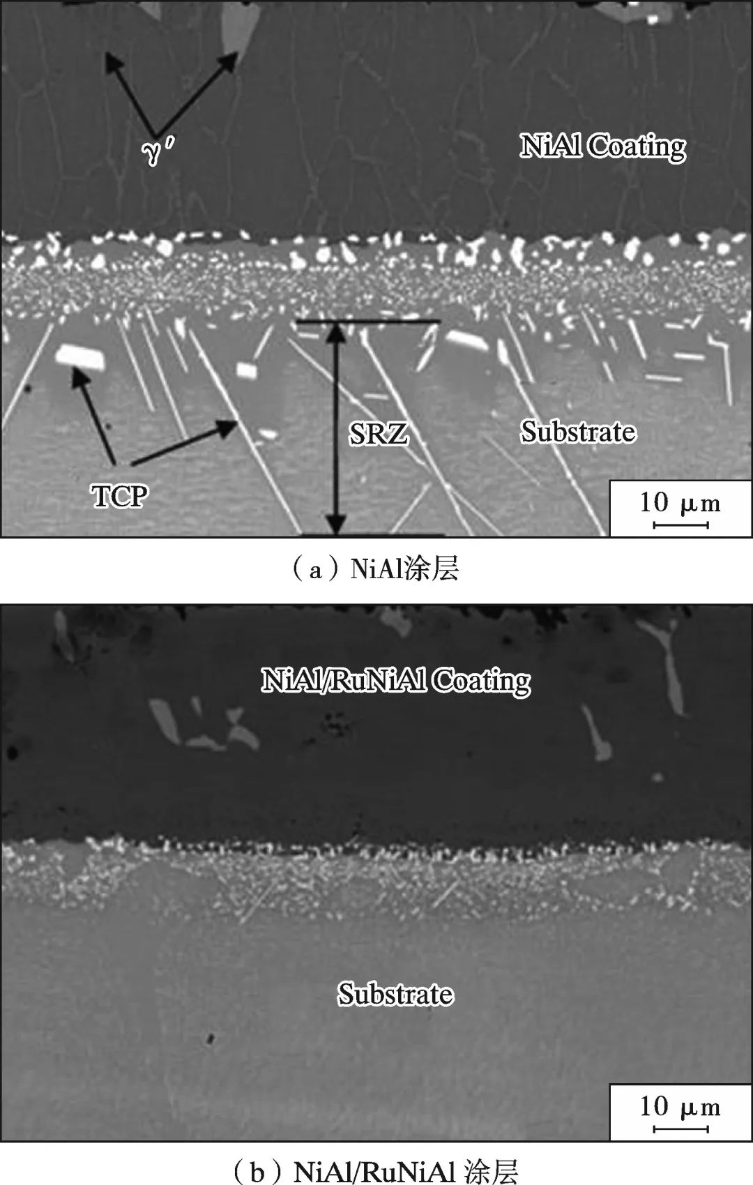 (1)铝化物涂层制备期间,涂层元素(Al)与基体元素(Ni、Re、W、Cr、Mo等)发生互扩散,相结构发生转变,在涂层/基体界面形成IDZ,并析出细小的片状或颗粒状的TCP相。服役期间继续元素互扩散在IDZ下方形成SRZ,并析出长针尖状的TCP相;