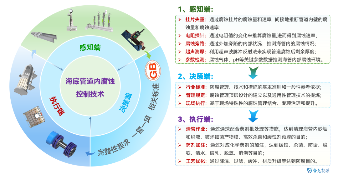 基于完整性管理理念,海底管道腐蚀突出“全生命周期”的理念,从“设计、评估、措施、检测、监测、维修”形成管理循环,类似与PDCA循环提升思路。从生产运营阶段来看,内腐蚀管控可尝试划分为“感知端、决策段、执行端”,如图2所示: