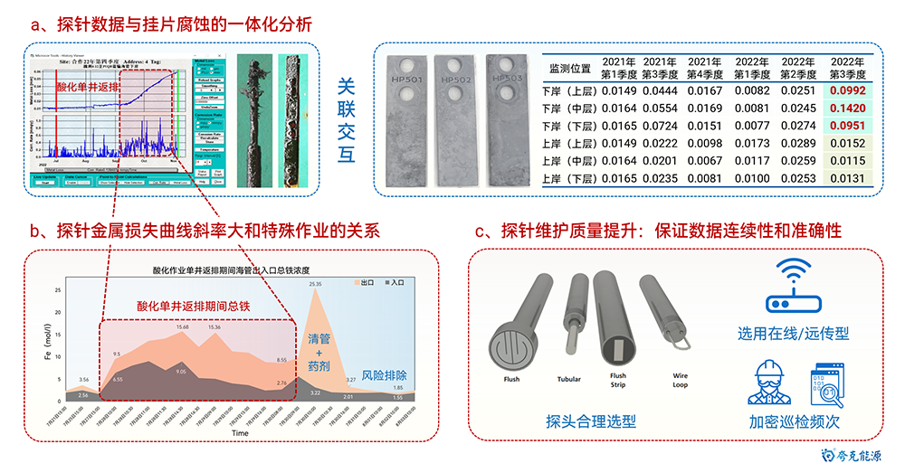作为能连续反应现场腐蚀状态的监测装置,目前应用广泛和认可度高。探针数据结果能够和挂片信息进行良好对应,特别对特殊工况(钻完井返排、清罐排放、药剂调整、物流切换、产量变化等),能敏感观察到腐蚀环境的加剧性变化,并立即开展响应对应措施的调整。需要注意的是,现场探针的定期维护,对数据连续性和准确性非常重要。