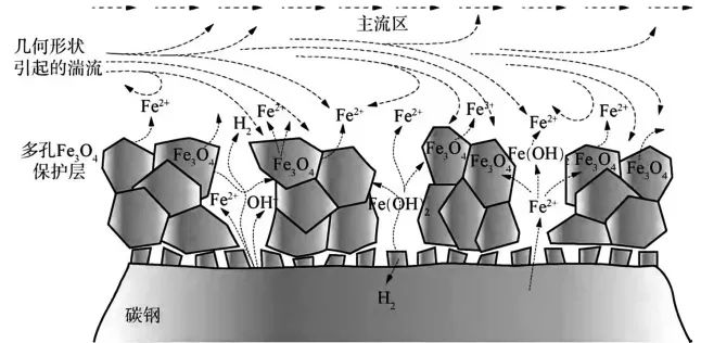 截至2020年8月,全球可运行核电机组共441台。核电厂二回路系统是发电系统的核心部分,碳钢、不锈钢、耐蚀镍合金、铜镍合金、钛合金等是二回路常用的金属材料。二回路给水管线、凝结水管线、疏水管线等不可避免地会发生流动加速腐蚀(FAC)。 统计数据表明,FAC引起的管道失效量占管道失效总量的33%,在所有管道失效因素中位列第一名。为预防和减少FAC导致的事故,技术人员从1970年前后就开始对FAC进行了研究。这些研究主要集中在FAC的机理、影响因素、预防及缓解措施等三个方面。 FAC的机理与影响因素 碳钢、不锈钢以及Cr合金等材料表面的氧化膜能够有效降低材料基体直接与外界接触造成的腐蚀。但表面的氧化膜与溶液接触会发生溶解,若溶液是流动的,还会加速溶解过程,该现象称为FAC。 氧化膜溶解会导致金属基体暴露发生腐蚀,从而使材料厚度减薄,产生安全隐患。FAC现象在核电、石油和天然气行业都较为常见。 FAC过程是基体-氧化膜界面和氧化膜-溶液界面的微观溶解(传质)过程。以碳钢为例,FAC的机理如图1所示,在基体-氧化膜界面处,基体中的铁通过氧化反应转变为Fe3O4、Fe(OH)2;在氧化膜-溶液界面处,主要发生氧化膜溶解产生可溶性Fe2+这一过程,Fe2+通过流体边界层向主流区域扩散。因此,FAC的整个过程可以视为金属氧化膜和基体的溶解引起了金属的减薄。 图1 碳钢FAC机理示意 FAC的发生可以看作是两个相互影响过程,即化学溶解和传质过程。当这两个过程的影响因素发生变化时,FAC会随之产生偏移。这些影响因素可归结为流体动力学因素、化学环境因素、材料因素。 流体动力学因素 流体在管道中的流动状态受流体流速、管路几何形状、流体各相比等影响。二回路系统中的主要介质为化学处理过的碱性水,在不同管段以过热干蒸汽、湿蒸汽、饱和液等形态存在。流动状态与流体形态都会影响FAC的传质过程。 流速 流动边界层是金属氧化膜溶解产生的铁离子向主流区域扩散的通道,其扩散速率(传质速率)与边界层厚度成反比,流速越大,边界层厚度越小,则传质速率越快。 伊成龙测定了内径为2.0、2.2、2.4 mm的P11钢管在温度273 ℃下的FAC速率,结果发现内径为2.0 mm的钢管减薄最严重。 UTANOHARA等研究发现,90°弯头的FAC速率随着流速增加而增加,当流速为0.39~5.74 m/s时,对应的FAC速率为0.1~0.35 mm/a,流速与FAC速率之间的关系是非线性的。 SUBRAMANIAN等和YONEDA等的研究得到了相似的结论,即FAC的速率与流速的1.0~1.5次幂成正比。 SATOH等通过数据拟合得到FAC速率与流速的1.7次幂成正比的结论。试验条件不同是导致幂指数存在差异的原因。 管道几何形状 当流道(孔板、变径、弯头、三通等)的几何形状发生突变时,会产生涡流、回流等现象,内部的传质过程发生变化。 AHMED分析了弯头、孔板等部件上下游流场及FAC速率的变化,发现流体流经管道部件会产生邻近效应,导致下游临近管线FAC减薄率上升近70%;同时明确了受临近效应影响的下游管线长度约为管道直径的5倍。 马娜等将某核电厂由于减薄而更换下来的弯头进行了X射线衍射分析,结合弯头先前的工作参数,发现弯头曲率过小是导致其减薄的主要原因。 SINGH等通过试验研究发现流体流经管道连接焊缝时,会在焊缝下游产生涡流,导致焊缝处材料FAC加重。 流体各相比 二回路中的流体主要涉及气液两相流。FERNG等使用台湾核电站低压汽轮机进行了气液两相流FAC试验,并指出气液两相流系统中的腐蚀主要由液滴撞击氧化膜产生,重力、离心力、两相分离等是影响腐蚀的关键因素。 AHMED等研究发现,在雷诺数相同情况下,当入口流体中气相质量分数由0.001%增加至0.003%时,孔板下游管段的FAC速率峰值下降约34.2%。 李鹏通过计算流体力学(CFD)软件模拟得到流速为0.58 m/s条件下,入口流体含气率在0.1%~1.0%范围逐渐增加时,弯头FAC速率从0.37 mm/a逐渐减小至0.13 mm/a。 环境因素 环境因素是影响FAC的众多因素中不可忽视的因素,包括流体温度、pH、溶解氧含量等。 温度 REMY等认为温度对FAC产生的影响是间接的,且具体表现在两个方面。一方面,随着温度的升高,溶液中亚铁离子含量降低;另一方面,温度对流体黏度和控制传质过程的亚铁离子扩散速率的影响非常大。 对于单相流,最大腐蚀速率出现在温度为130~150 ℃时;对于两相流,最大腐蚀速率则出现在100~250 ℃时。在温度为125、180、225 ℃时,碳钢表面氧化膜的厚度稳定在1 μm左右,125 ℃时氧化膜比较疏松,180、225 ℃时氧化膜变得比较致密,在温度超过130 ℃时,碳钢表面氧化膜的孔隙率随温度升高而变小。 pH Fe3O4的溶解与FAC速率有直接关系,当pH<9.8时,Fe3O4的溶解度随温度升高而增大,当pH为9.8~10.3时,Fe3O4的溶解度随着温度升高而降低。这是因为温度影响了Fe(OH)2与Fe3O4转换的反应平衡常数。 王柱等研究发现,在气液两相条件下,当某电厂二回路的给水pH由9.0提高至9.6,给水中铁离子质量分数由2.2 μg/kg降至1.0 μg/kg时,管壁减薄速率下降约100倍。 溶解氧含量 JIANG等发现对蒸汽发电回路进行微氧处理后,管道内亚铁离子质量分数下降约80%。这是由于加氧处理后,氧化膜表面的FeOOH和Fe2O3更易转化为Fe3O4。 WOOLSEY等分别在115 ℃、pH 9.1和150 ℃、pH 7.8条件下对碳钢进行了腐蚀减薄试验。结果发现:当二回路中氧气质量分数为2.1~3.0 μg/kg时,碳钢的减薄速率保持在0.99 mm/a,氧气质量分数达到3.8 μg/kg后,减