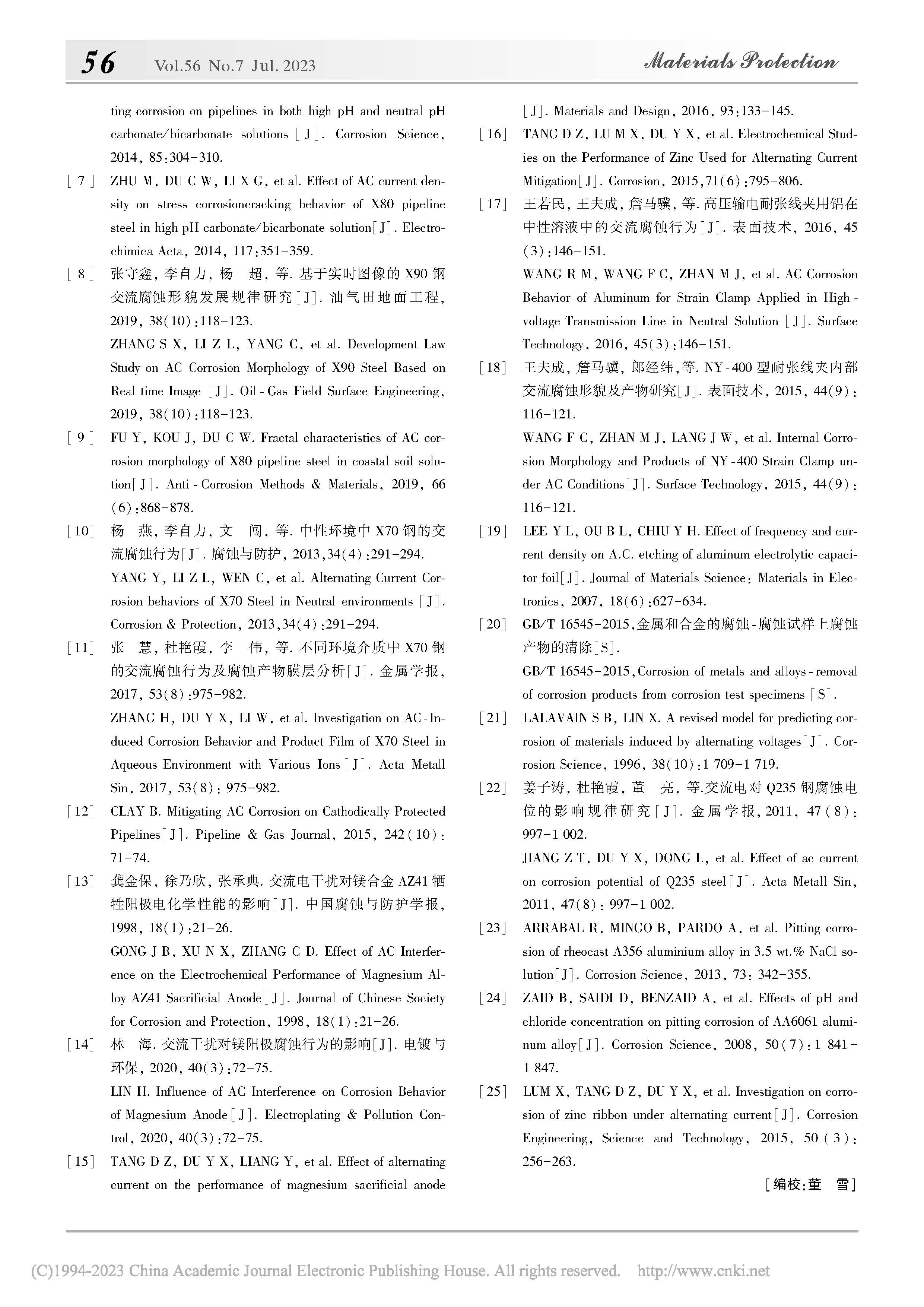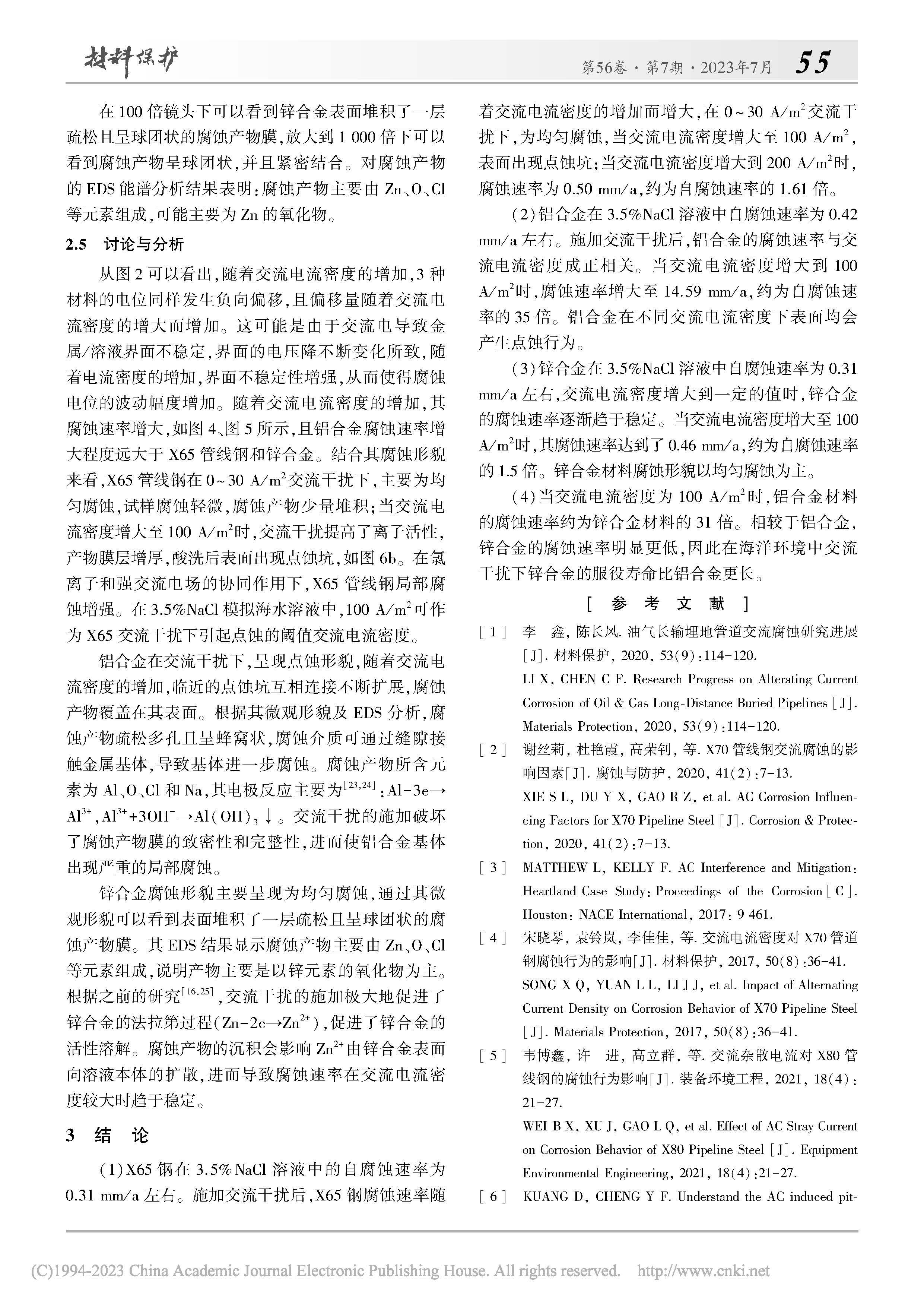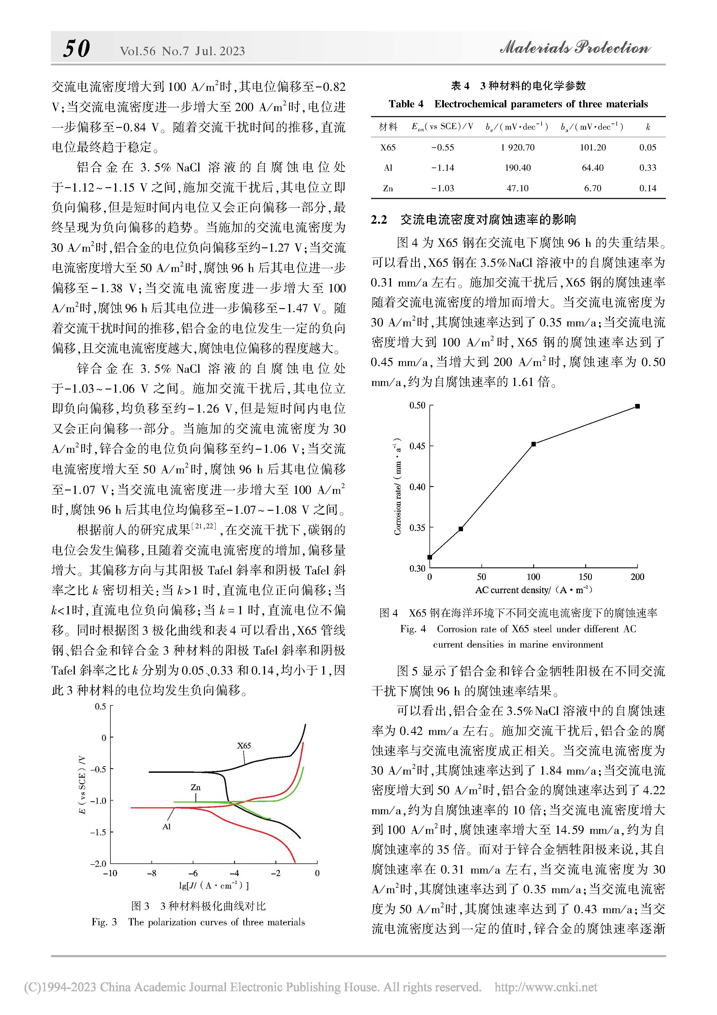X65 管线钢及牺牲阳极材料在海水环境中的交流腐蚀行为研究