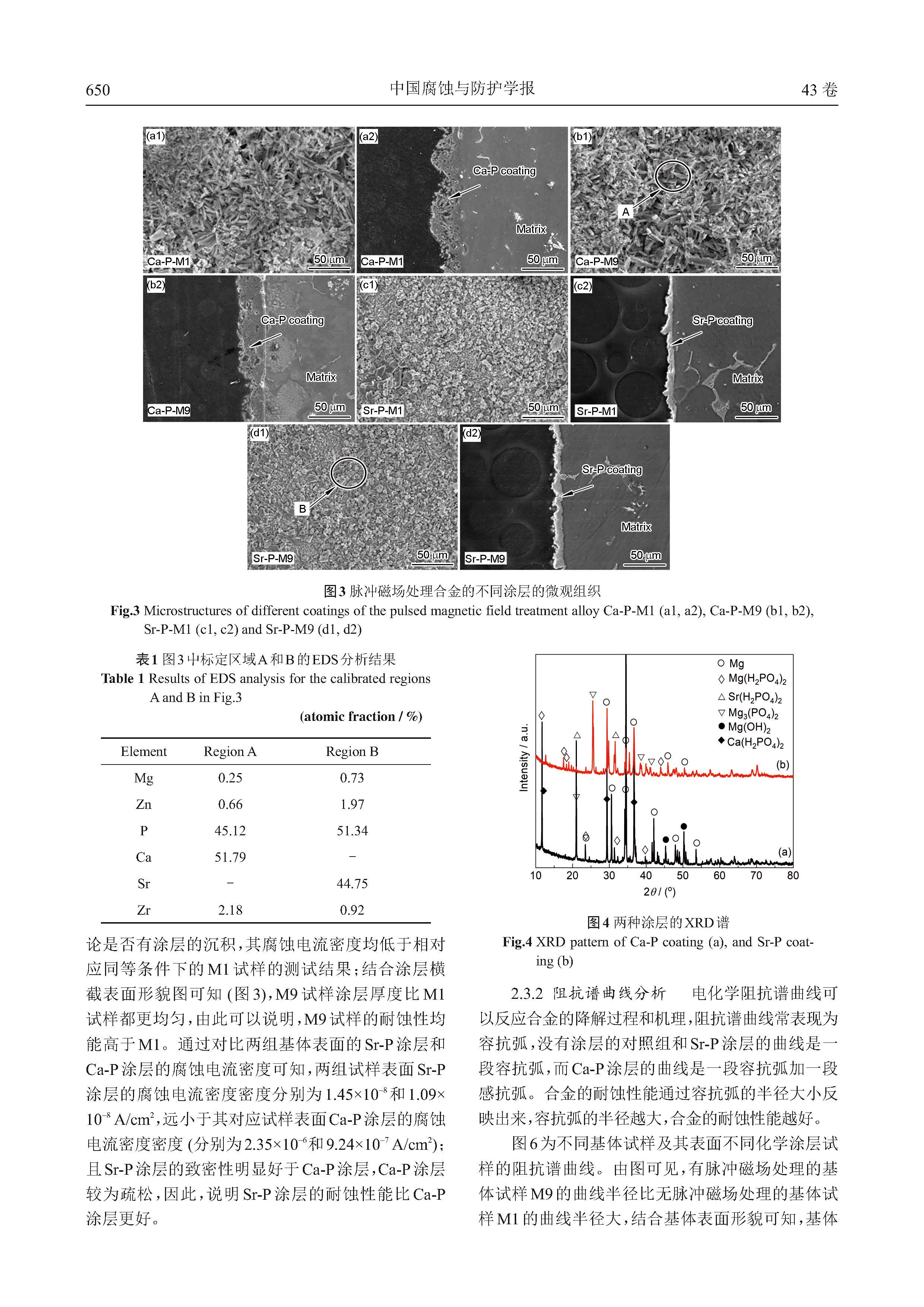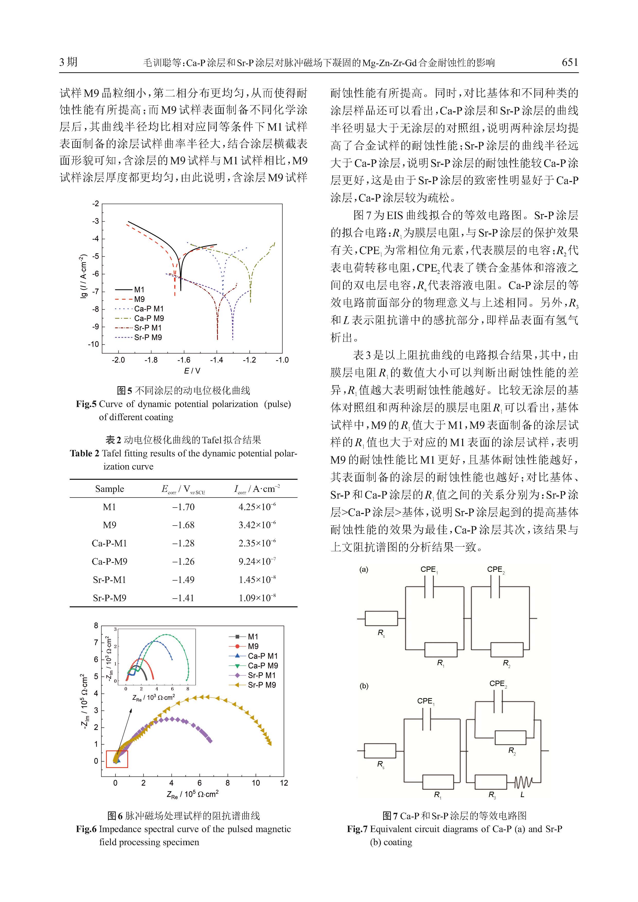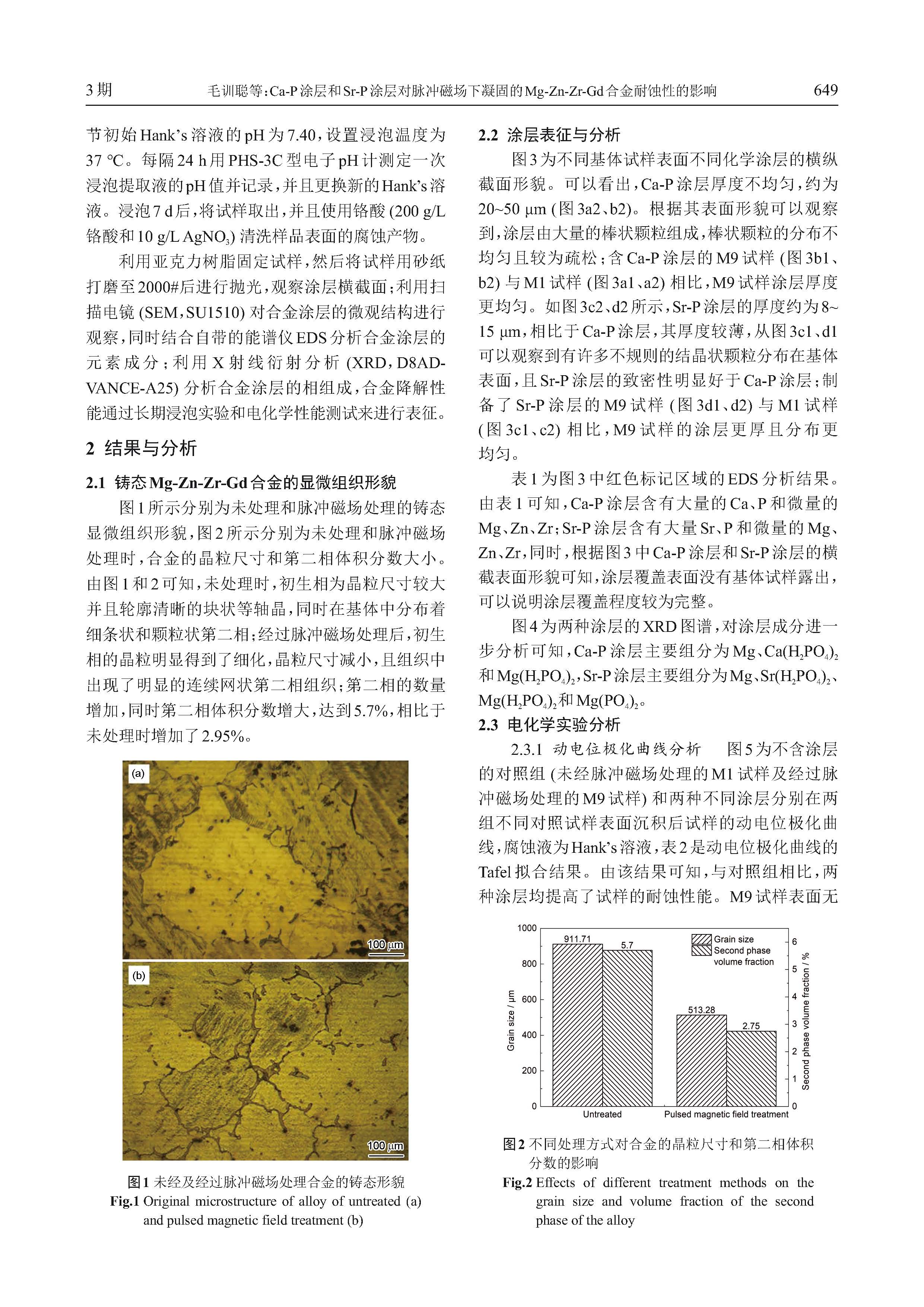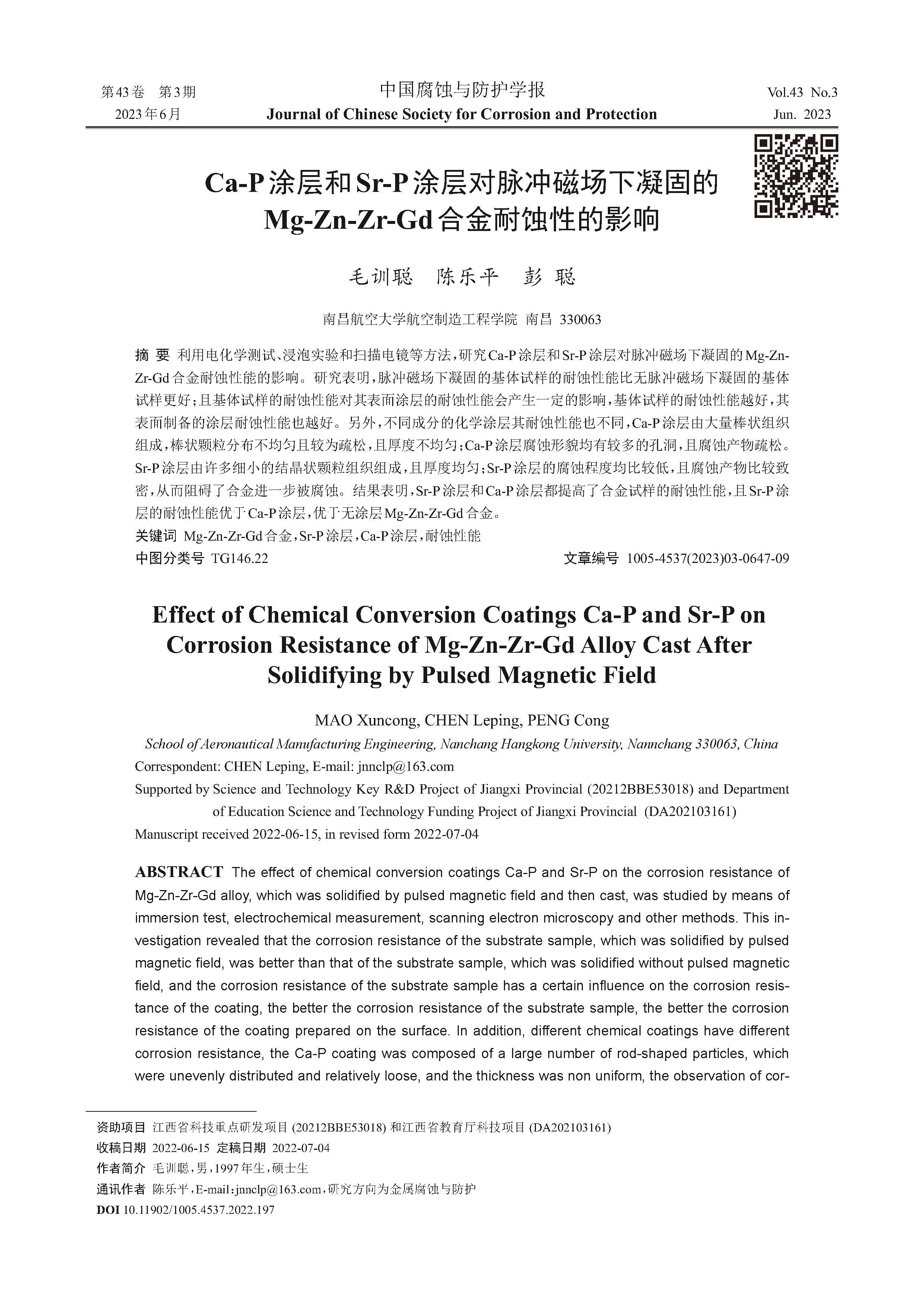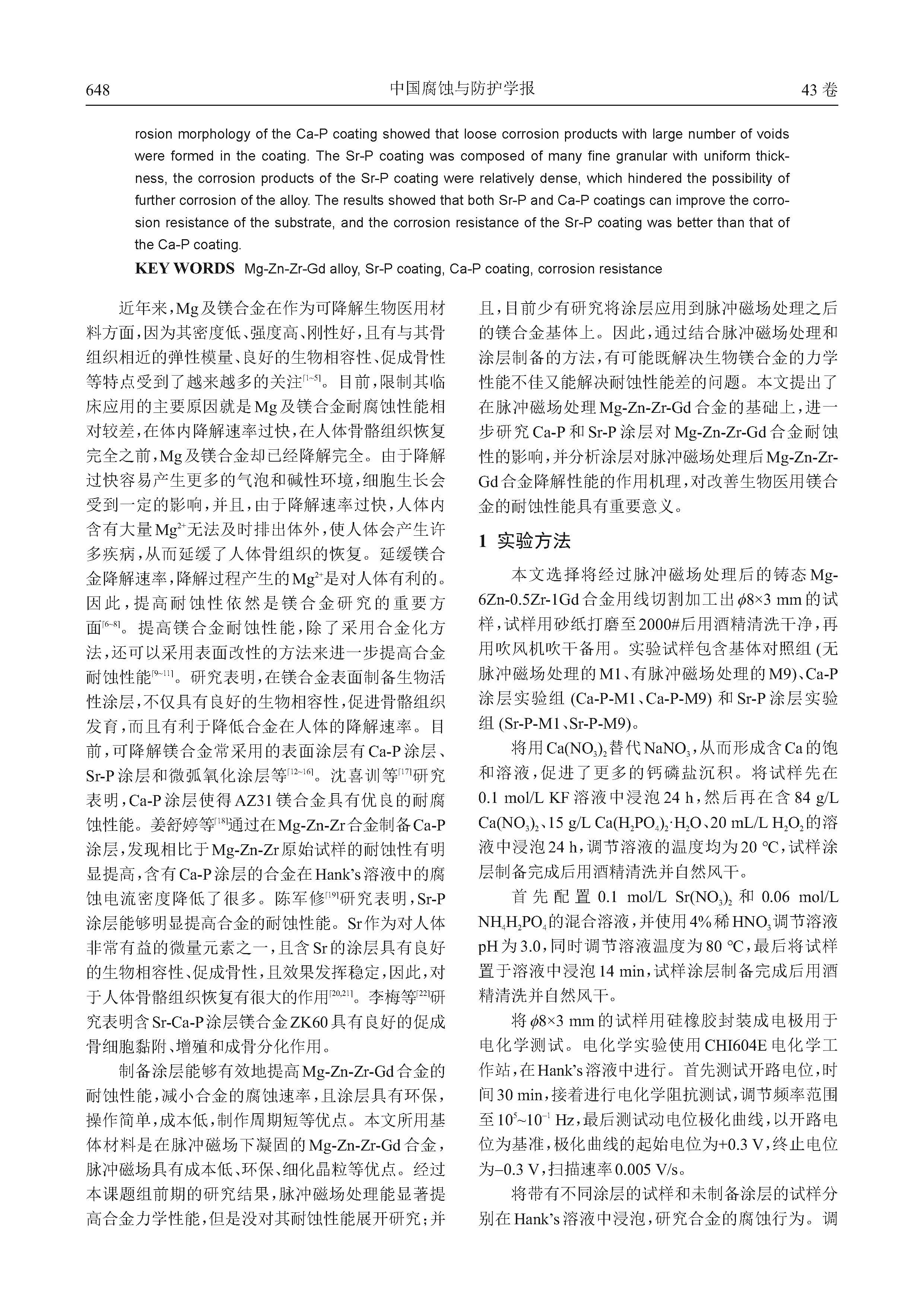 Ca-P涂层和Sr-P涂层对脉冲磁场下凝固的Mg-Zn-Zr-Gd合金耐蚀性的影响