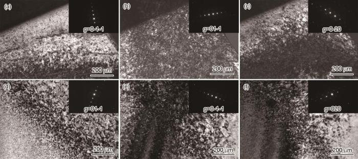 辐照后体心立方结构金属中的位错环,以<100>型和1/2<111>型两种间隙型位错环为主[28]。为了进一步比较不同类型位错环密度,图5给出了双束条件下的TEM表征结果。选取g0-1-1,g01-1,g00-2为g矢量方向,依据不可见准则g·b=0,结合衍射条件可以判断:经Kr离子辐照后AlNbMoZrB合金中产生的1/2<111>型位错环其体积密度大于<100>型位错环。不同类型位错环的结构特性,显著影响合金的力学性能[29]。温度低于500℃时<100>型位错环为不可动型位错环,大量的<100>型位错环阻碍位错运动从而使材料发生辐照硬化。1/2<111>型位错环为可动型位错环,在应力作用下可分解生成<100>型位错片段,使材料发生硬化效应。而AlNbMoZrB合金中产生的辐照诱导缺陷大部分为1/2<111>型位错环,对力学性能的影响较小。